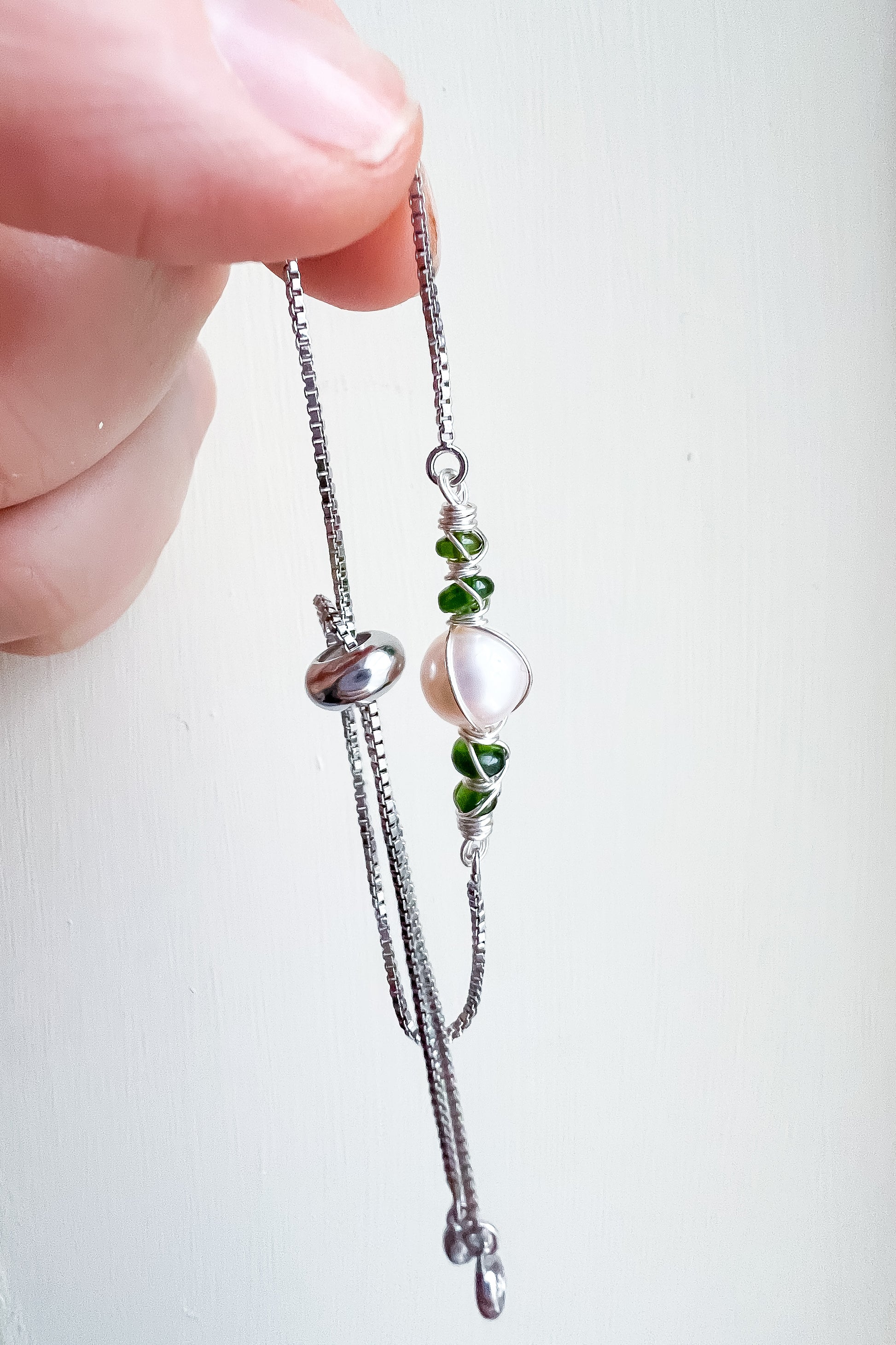 Beautiful natural pearl and chrome diopside adjustable bracelet.