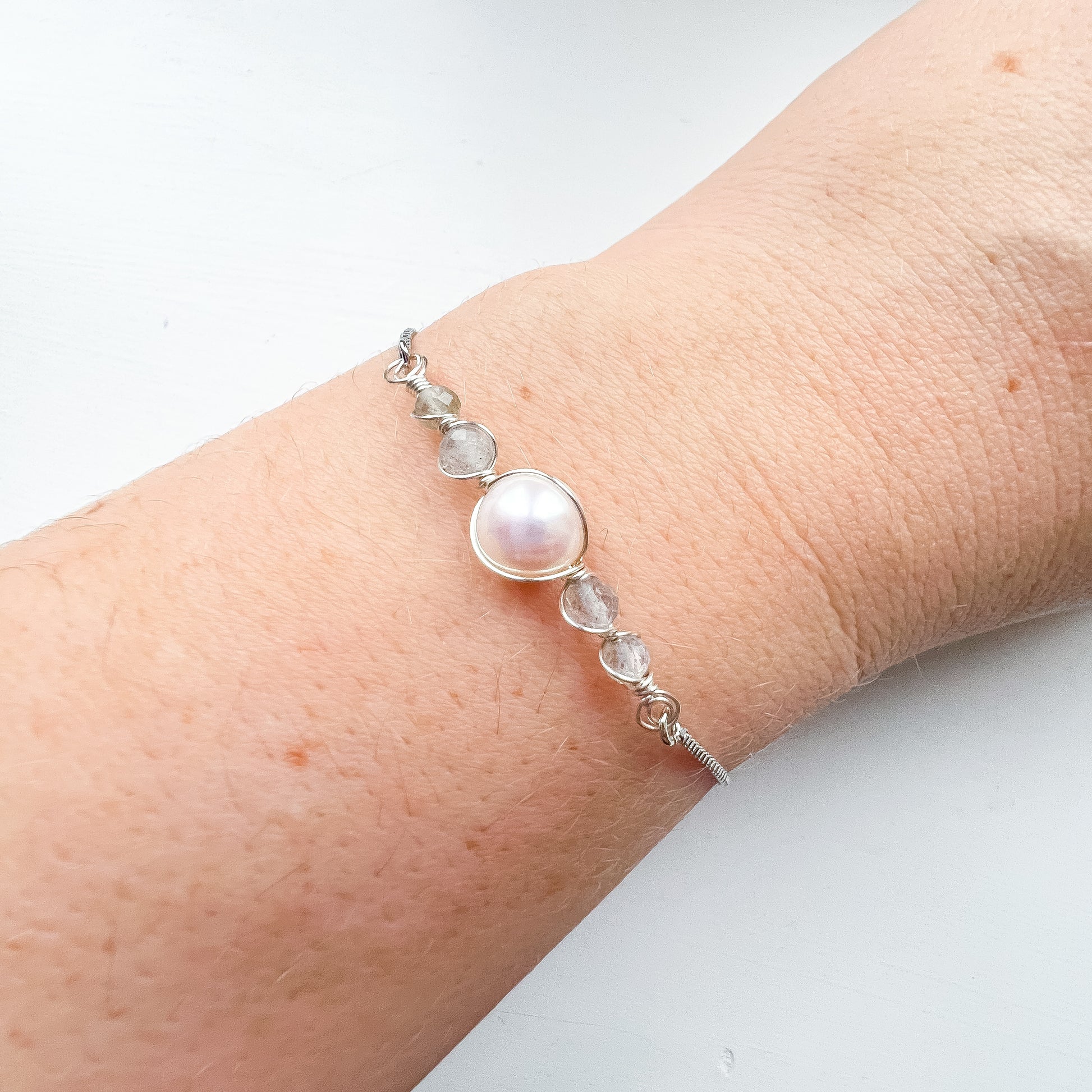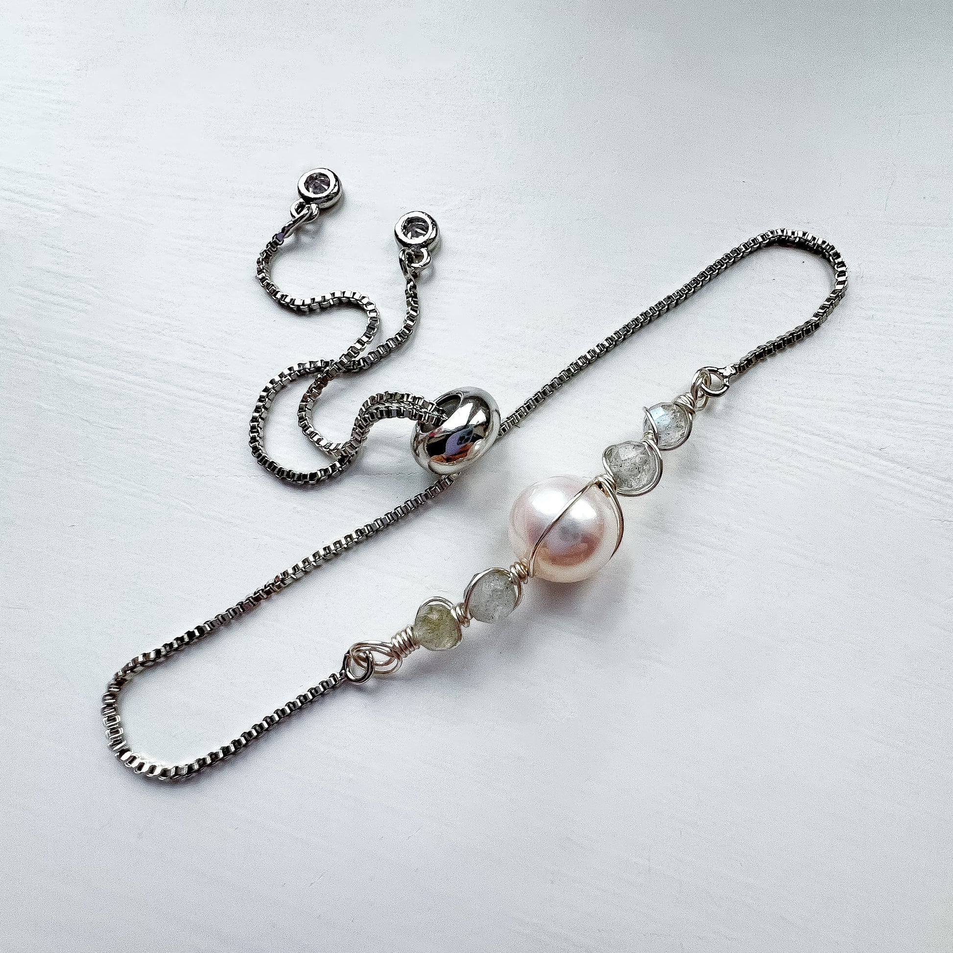 Beautiful natural pearl and labradorite adjustable bracelet.