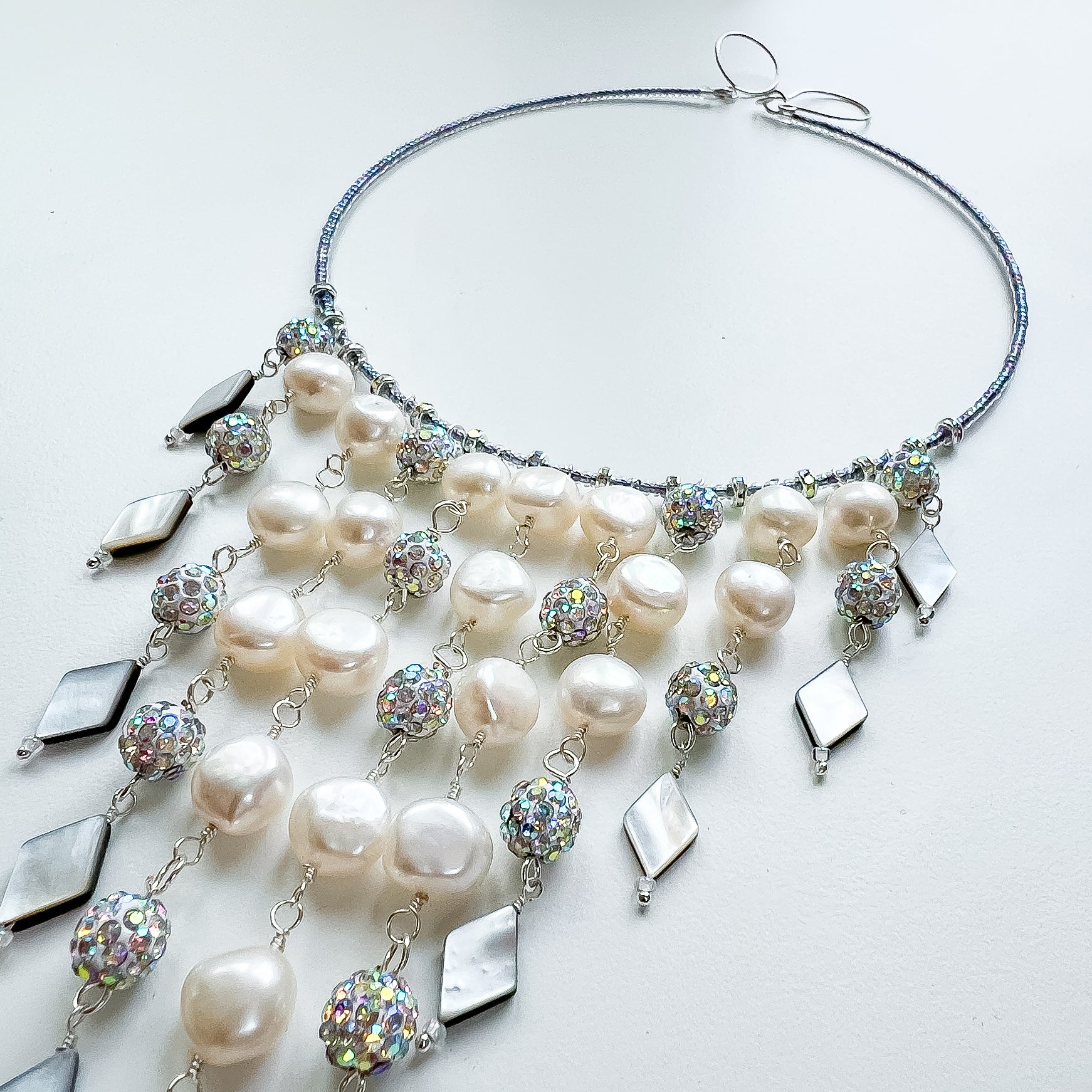 freshwater pearl necklace, AB CZ clay beads, mother of pearl jewellery, statement waterfall necklace, Miyuki seed bead necklace, silver plated wire jewellery, mermaid choker, celestial necklace, handmade pearl jewellery, dreamy ocean necklace, cascading pearl necklace, iridescent beaded necklace, gift for her, pearl and crystal choker