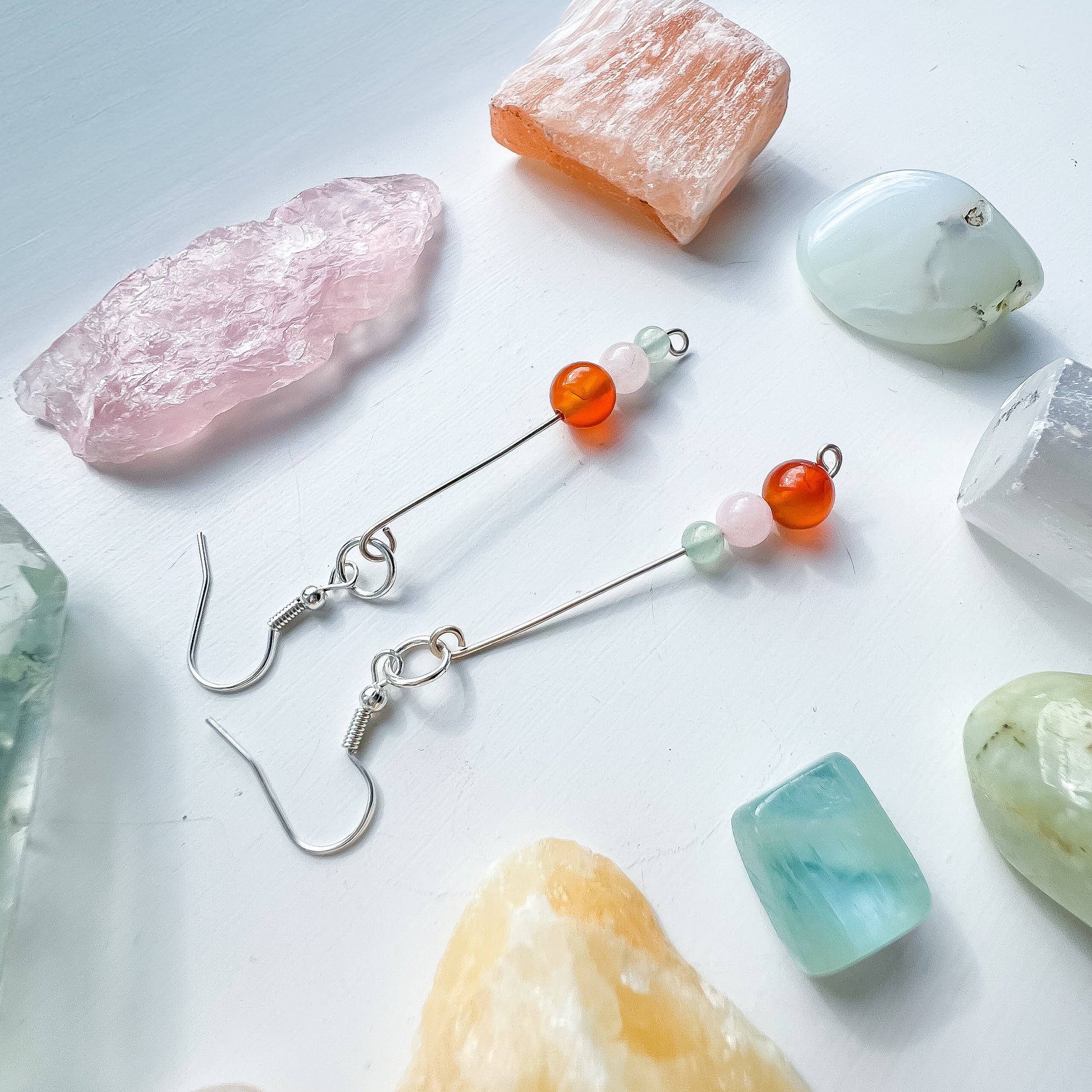 These long drop earrings combine the warm glow of carnelian, the soft pinkย of rose quartz, and the gentle green of aventurine in a minimalist design that moves with you.