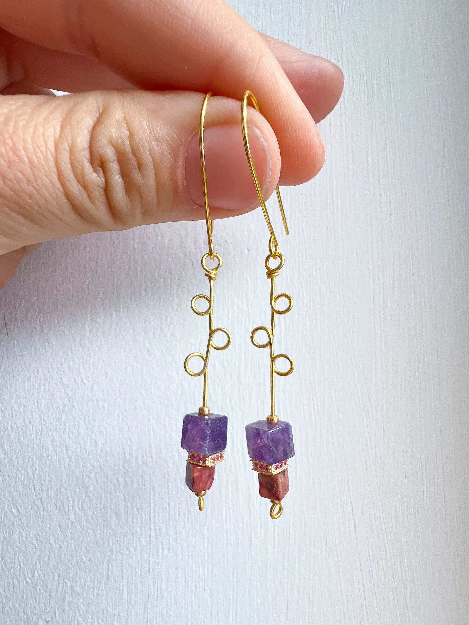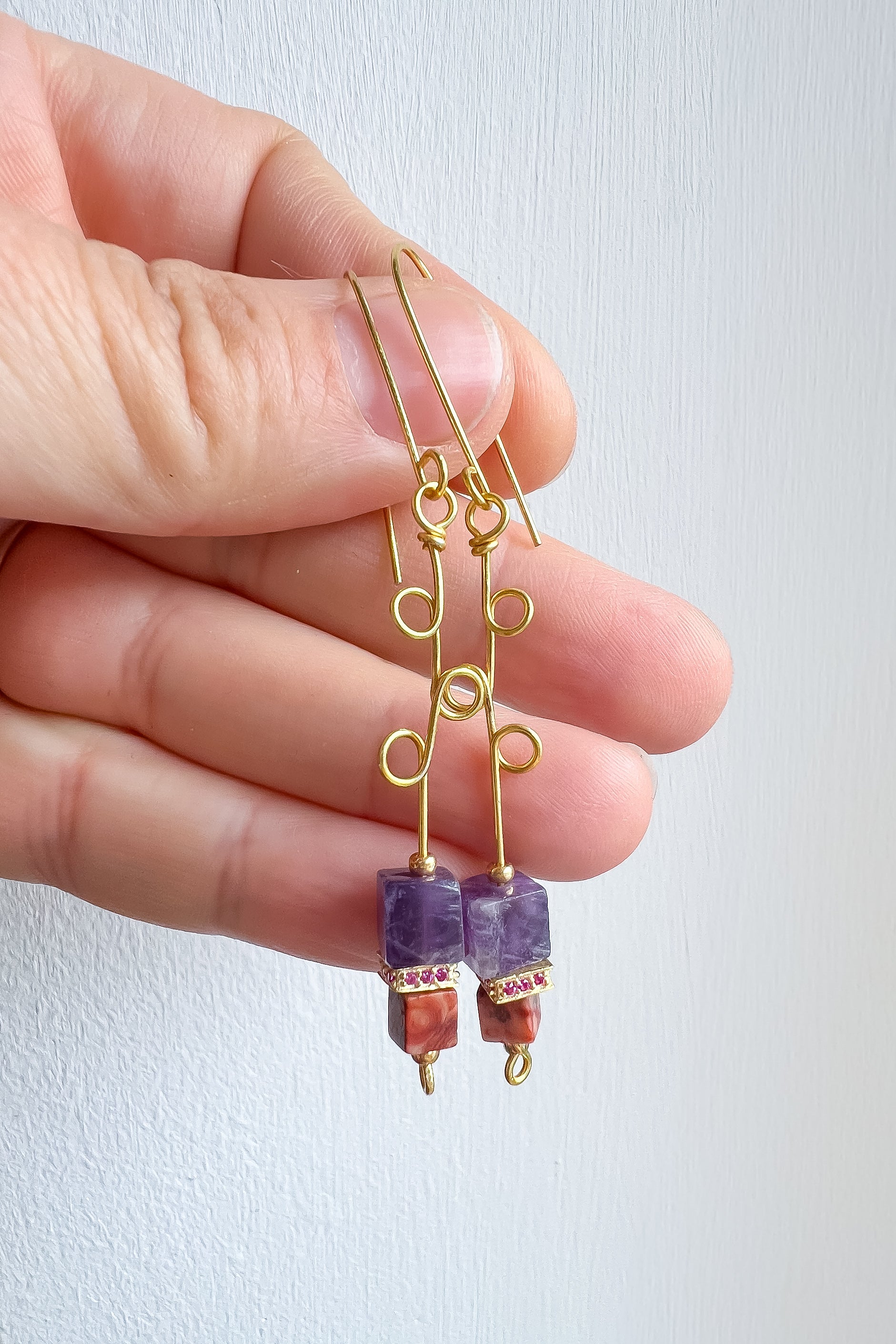 Each earring features a shimmering cube of Amethyst—a stone of clarity, spiritual insight, and calming energy—resting above a warm, earthy Crazy Lace Agate, known for joy, grounding, and protective energy. Between them glows a delicate gold and pink crystal spacer, a symbolic touch of heart-centered magic.