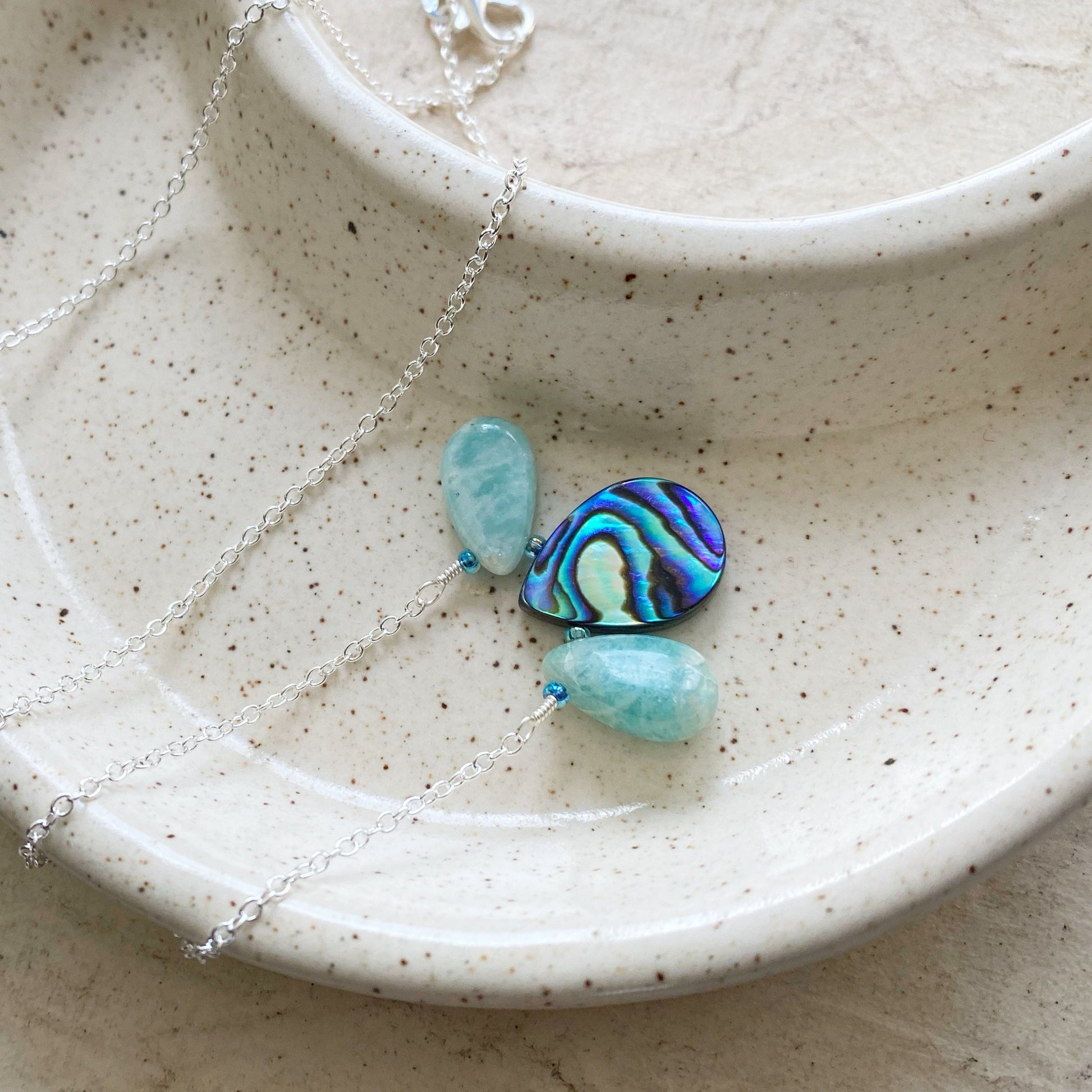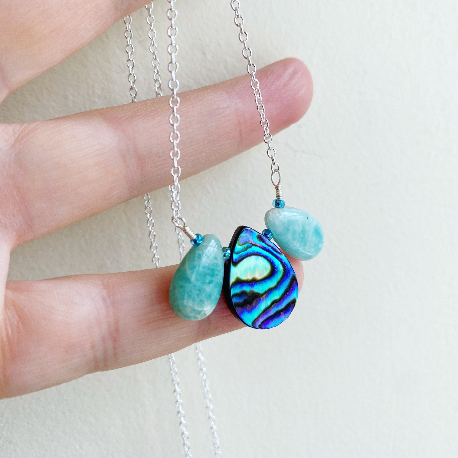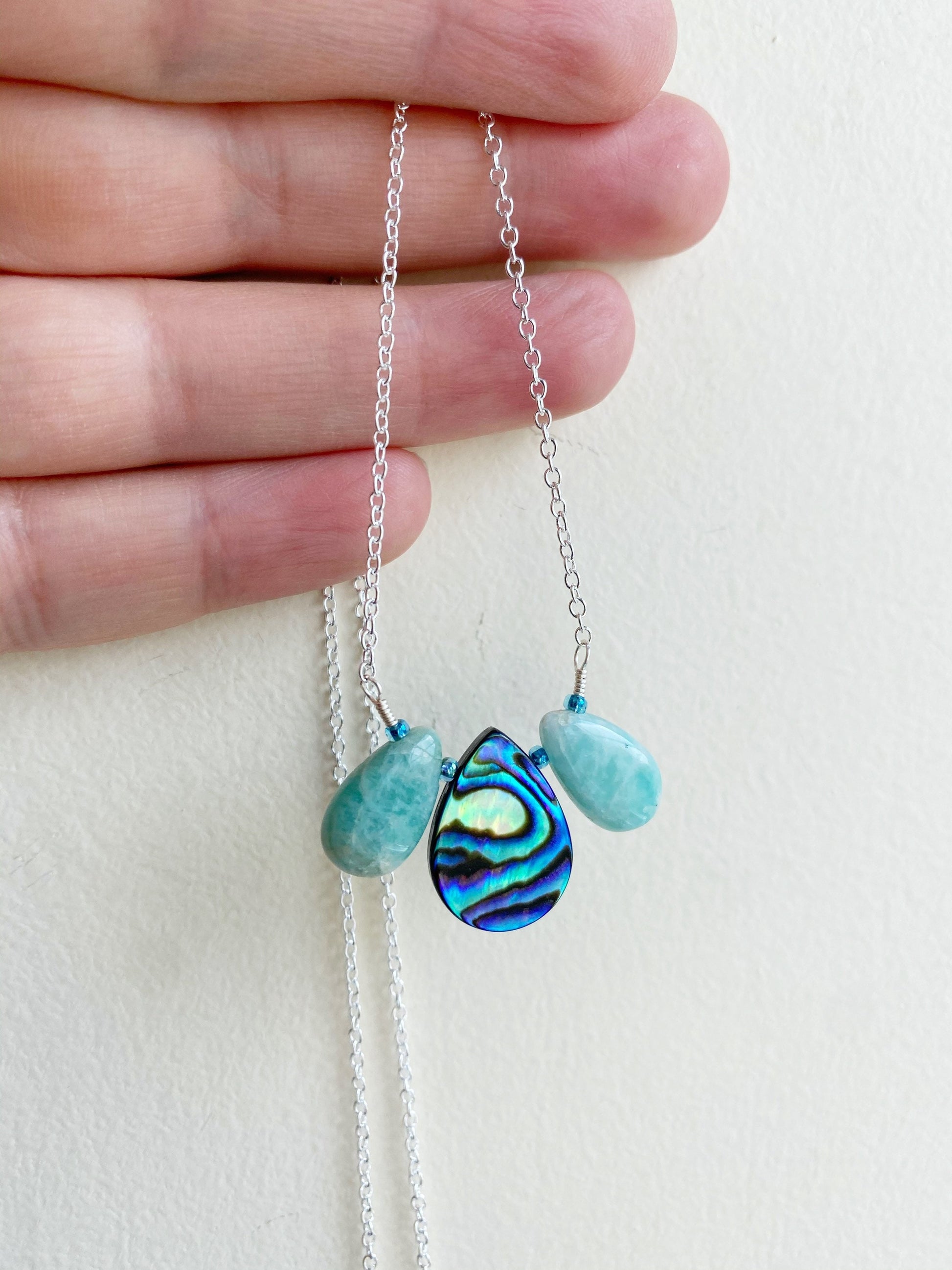 Beautiful natural amazonite and abalone necklace, hand wire wrapped with silver finish wire and chain.