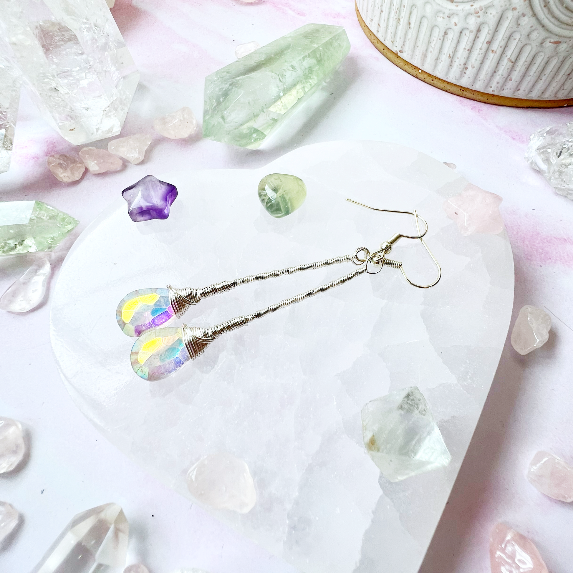 Gorgeous Aura Amethyst earrings with delicate silver colour wire work.