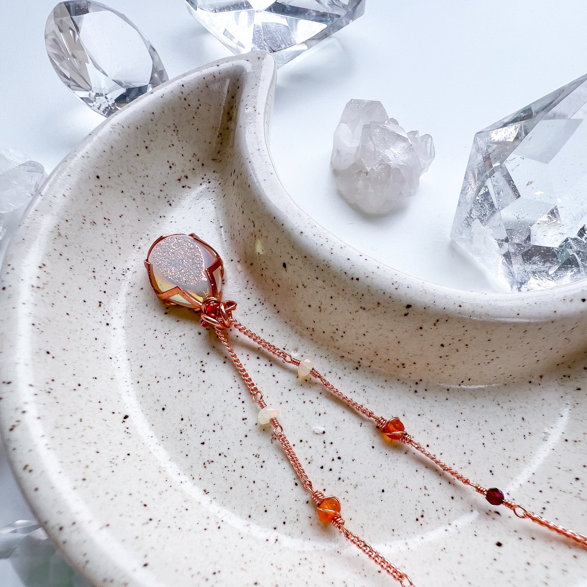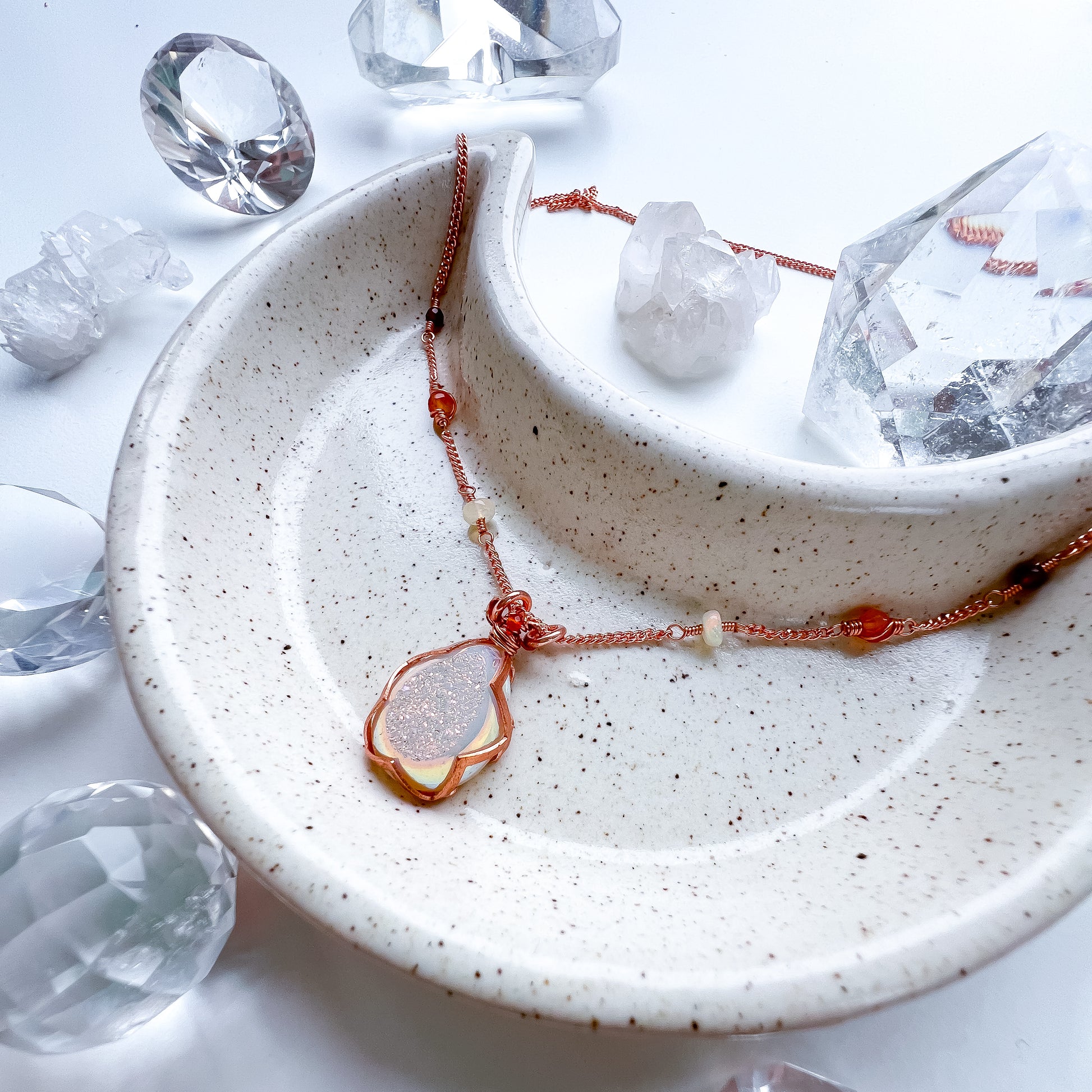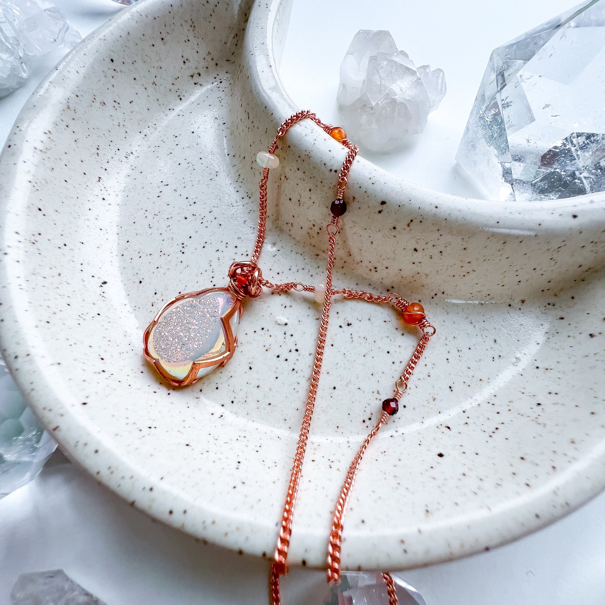 This beautiful aura druzy quartz been encased in rose gold copper gallery wire and has been finished with a delicate chain in the same material.