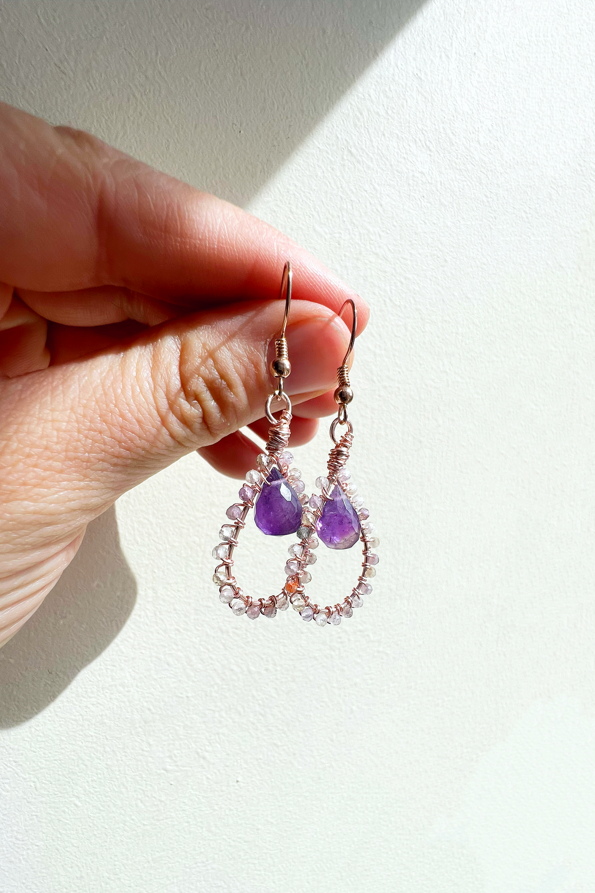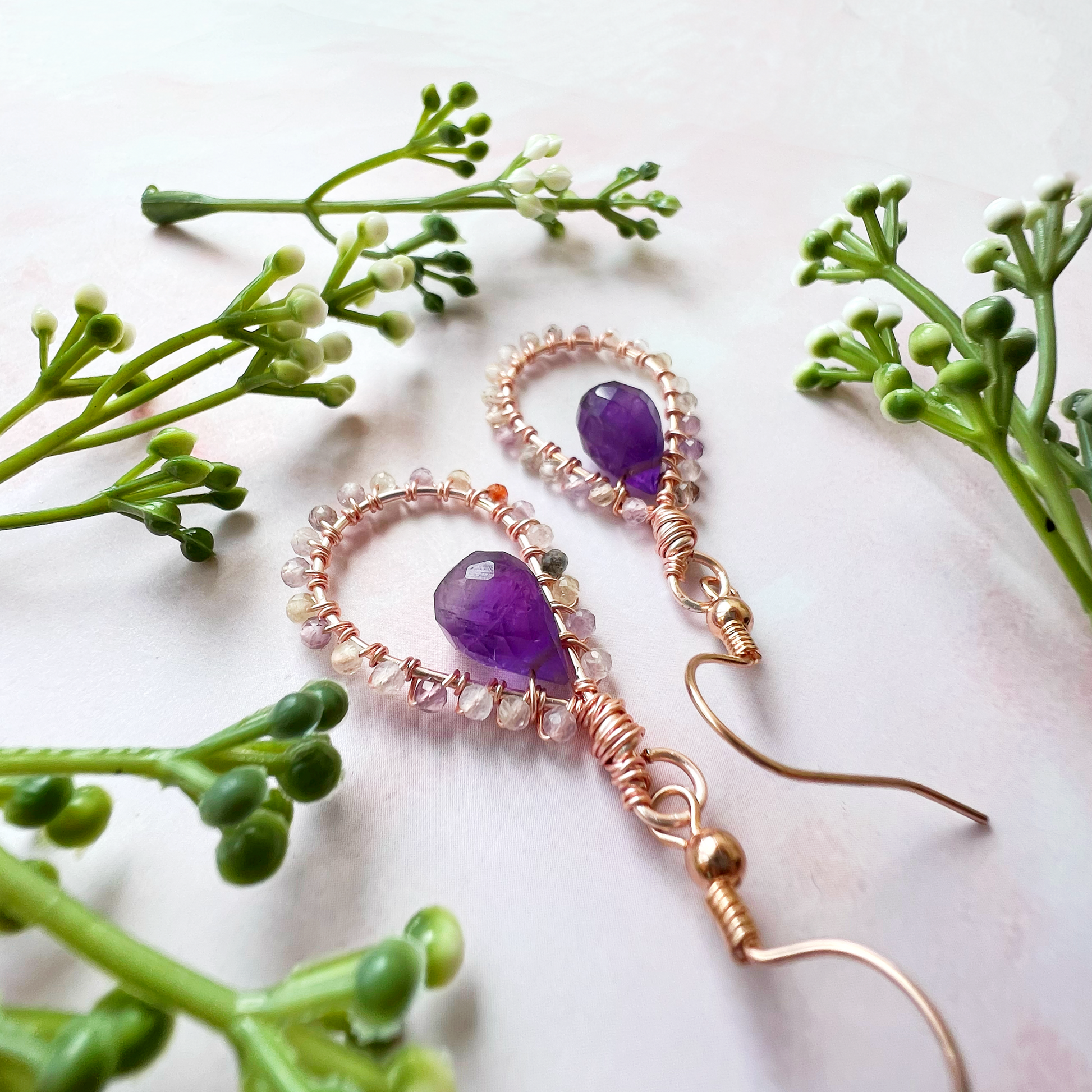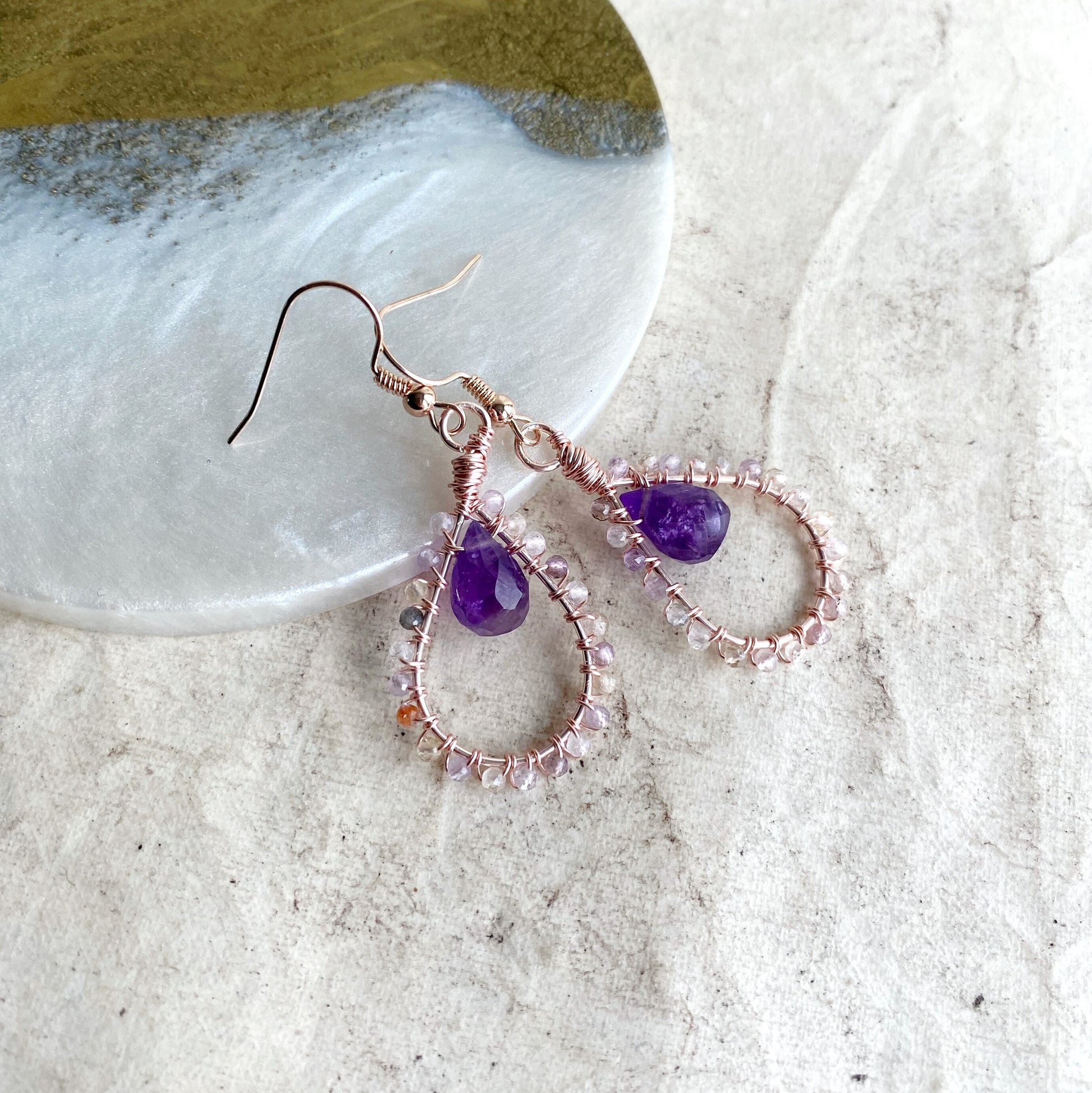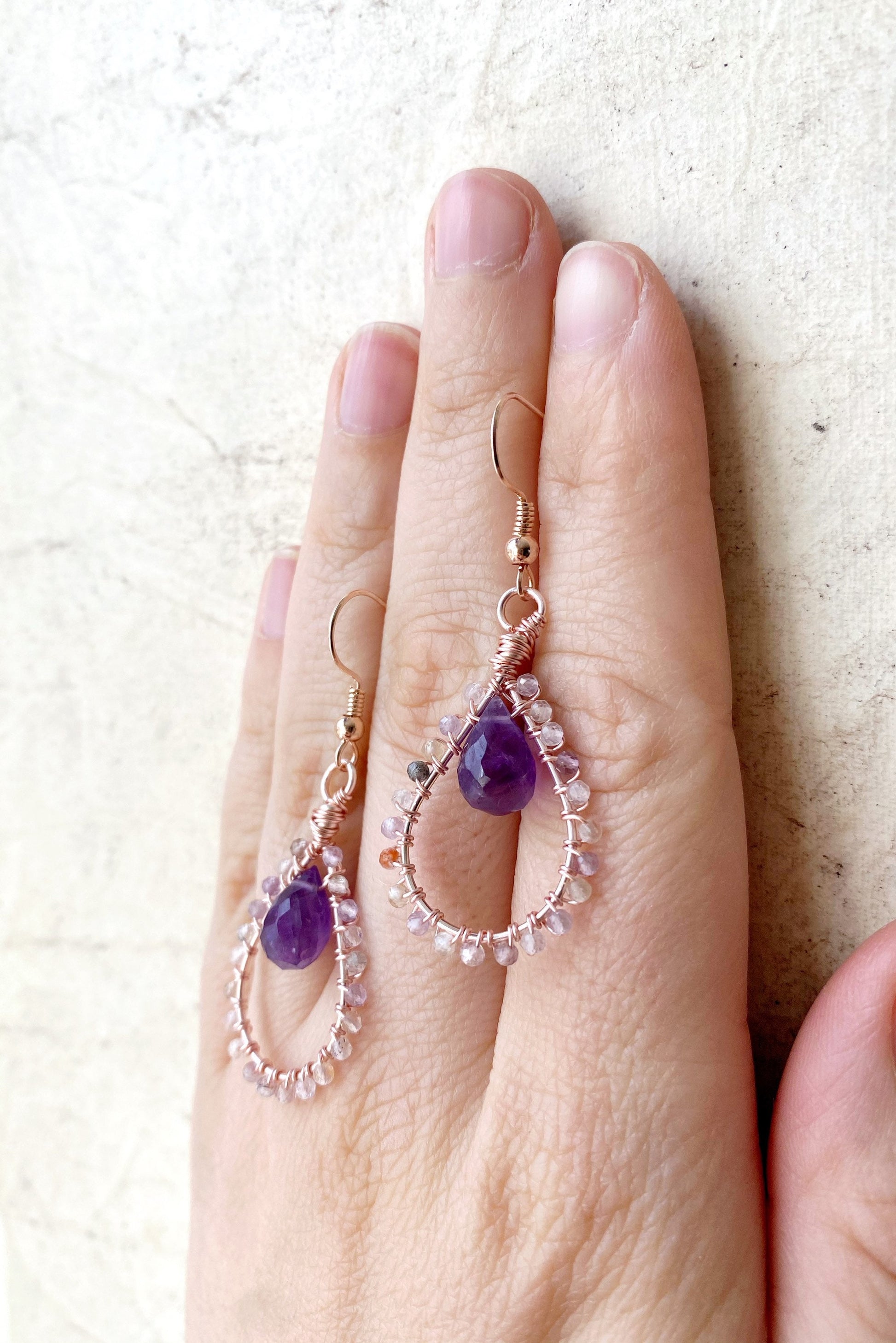The amethyst gemstone pears are a beautiful deep purple that look beautifully delicate with the auralite.