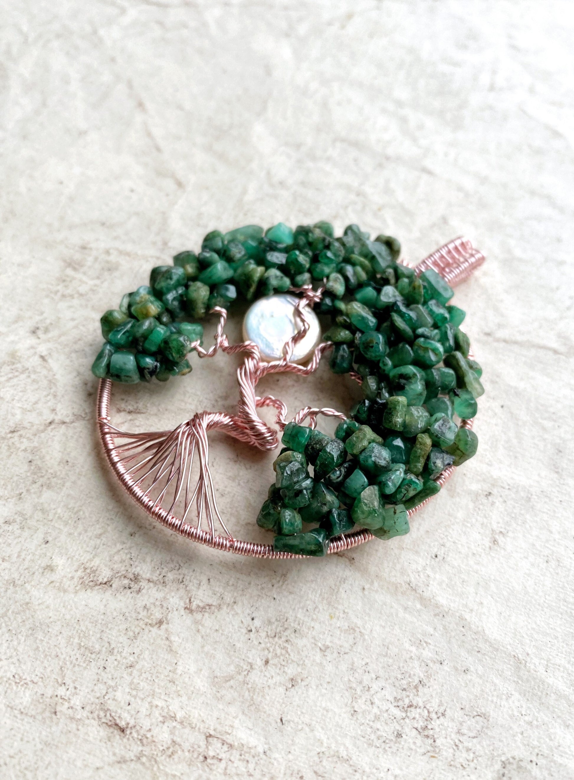 Gorgeous Emerald tree of life pendant with a beautiful pearl coin moon peeping through the branches.