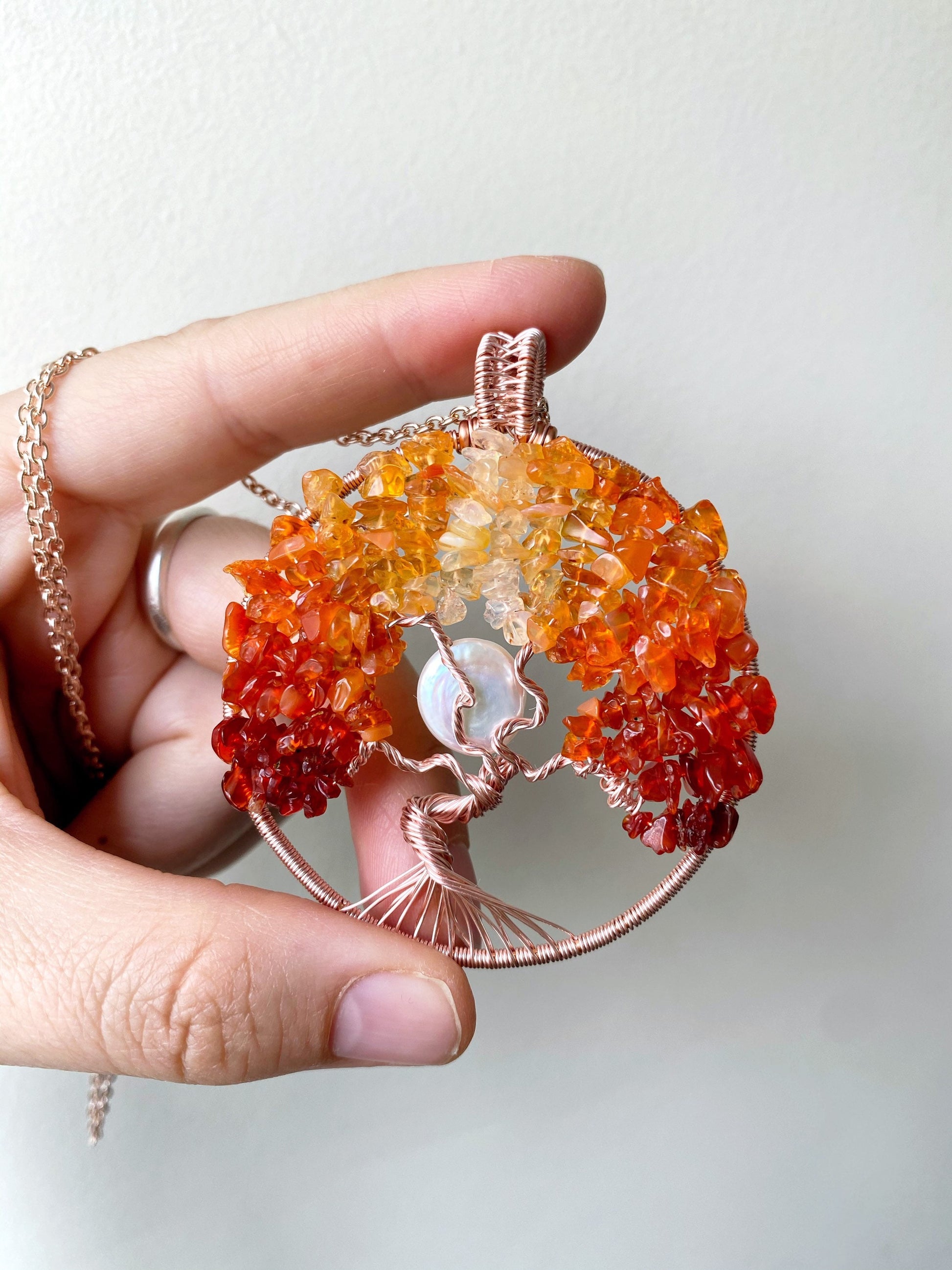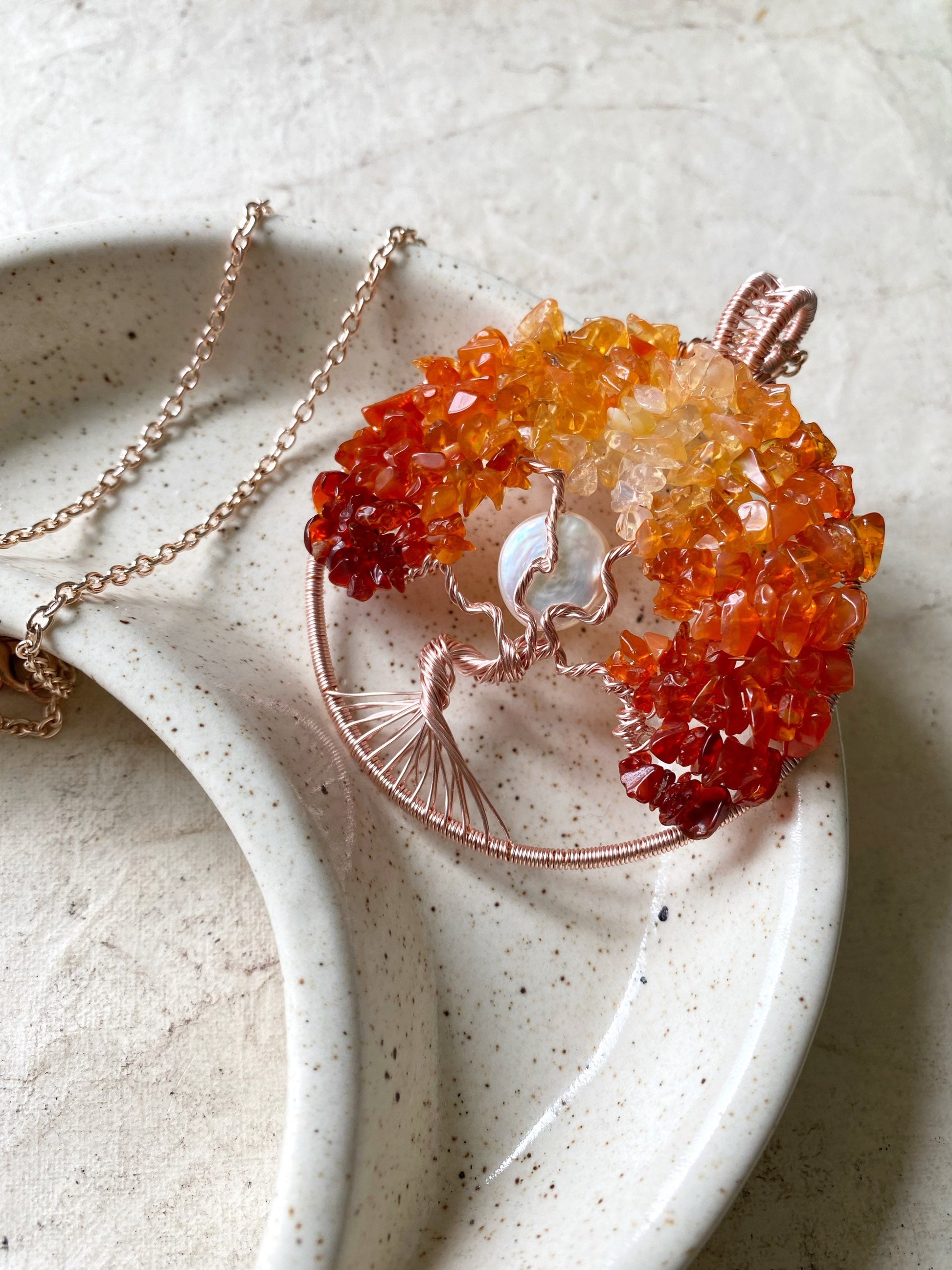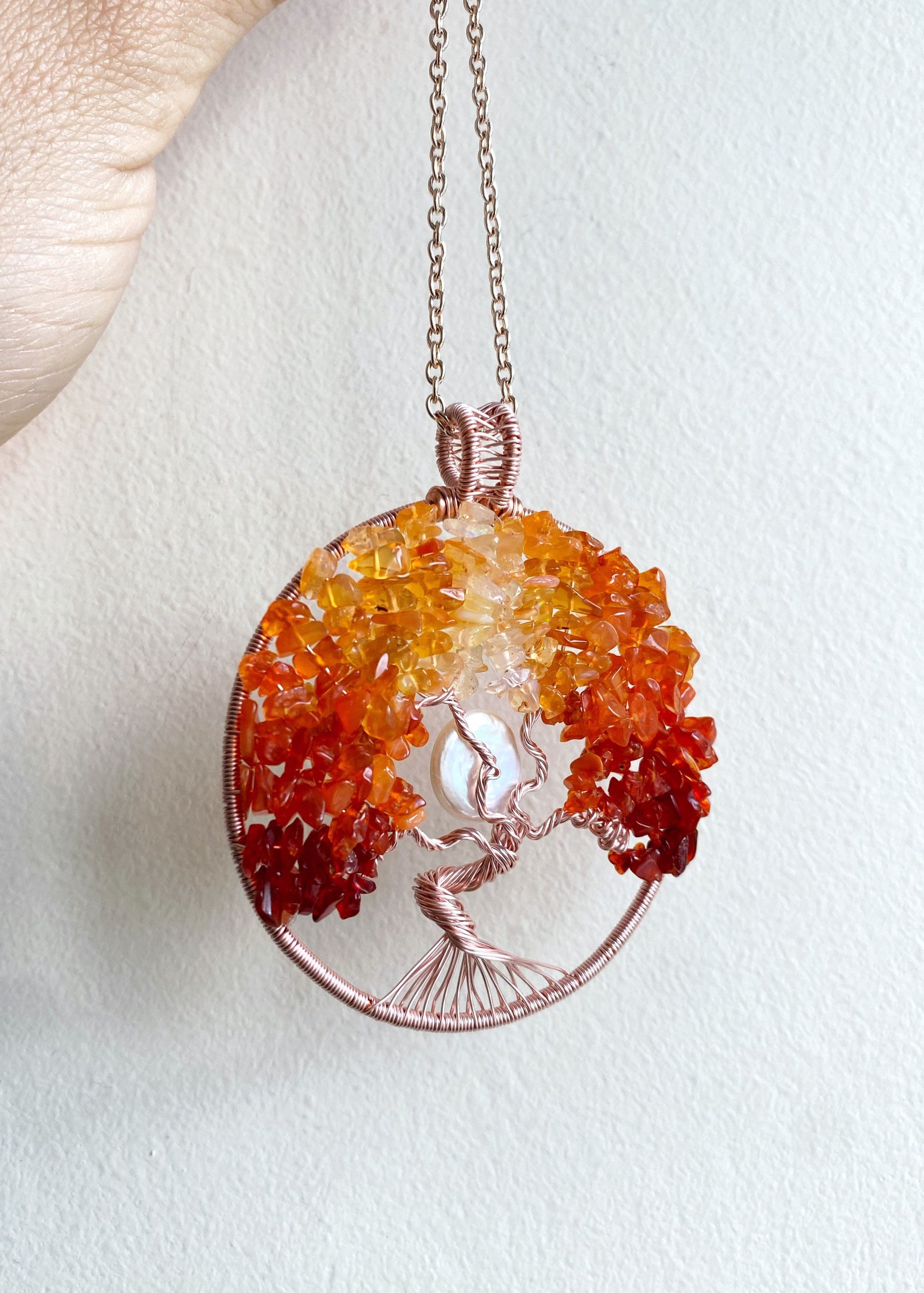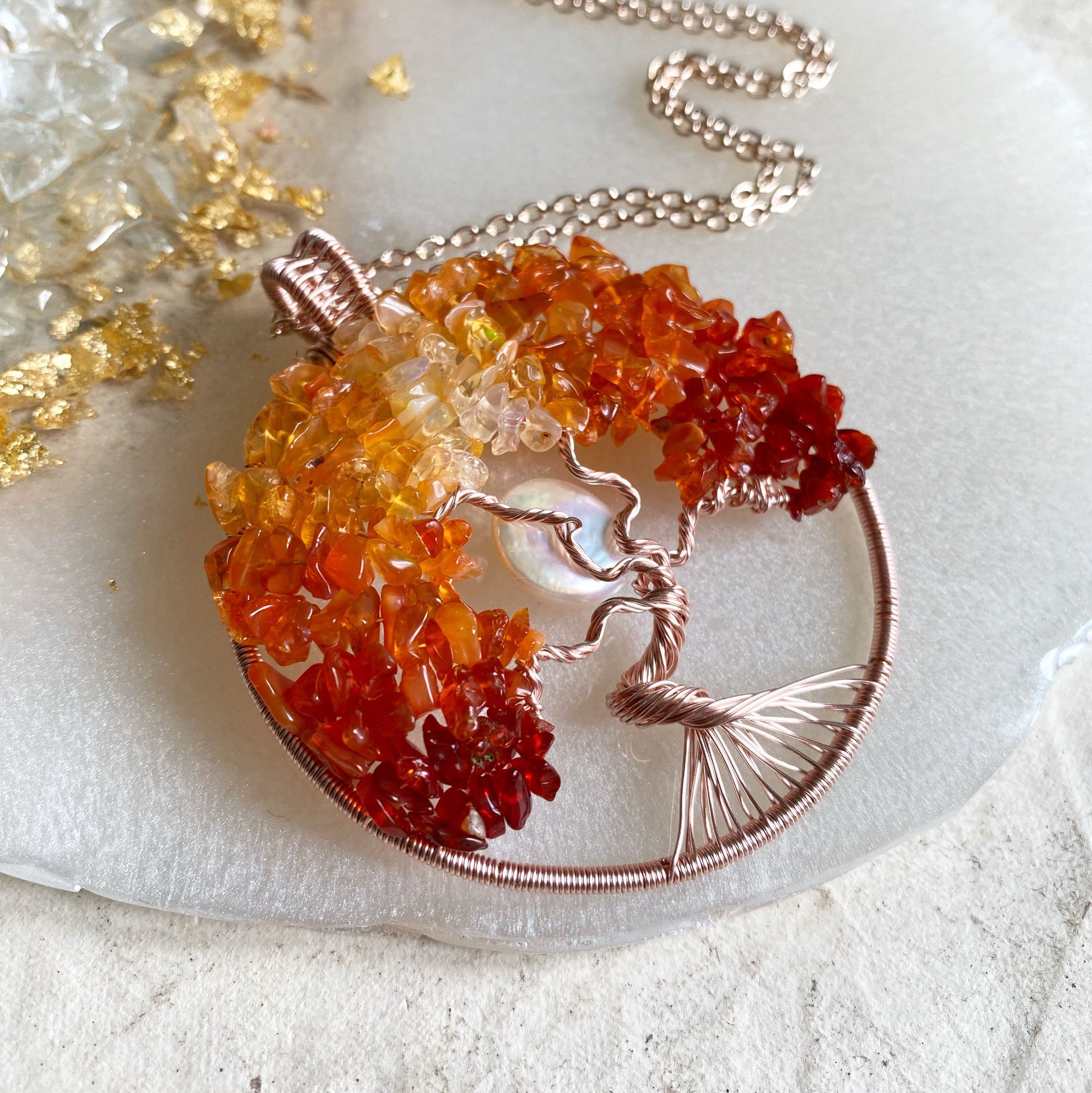 Gorgeous gemstone tree of life necklace made with fire opals finished in rose wire with a pearl coin moon.