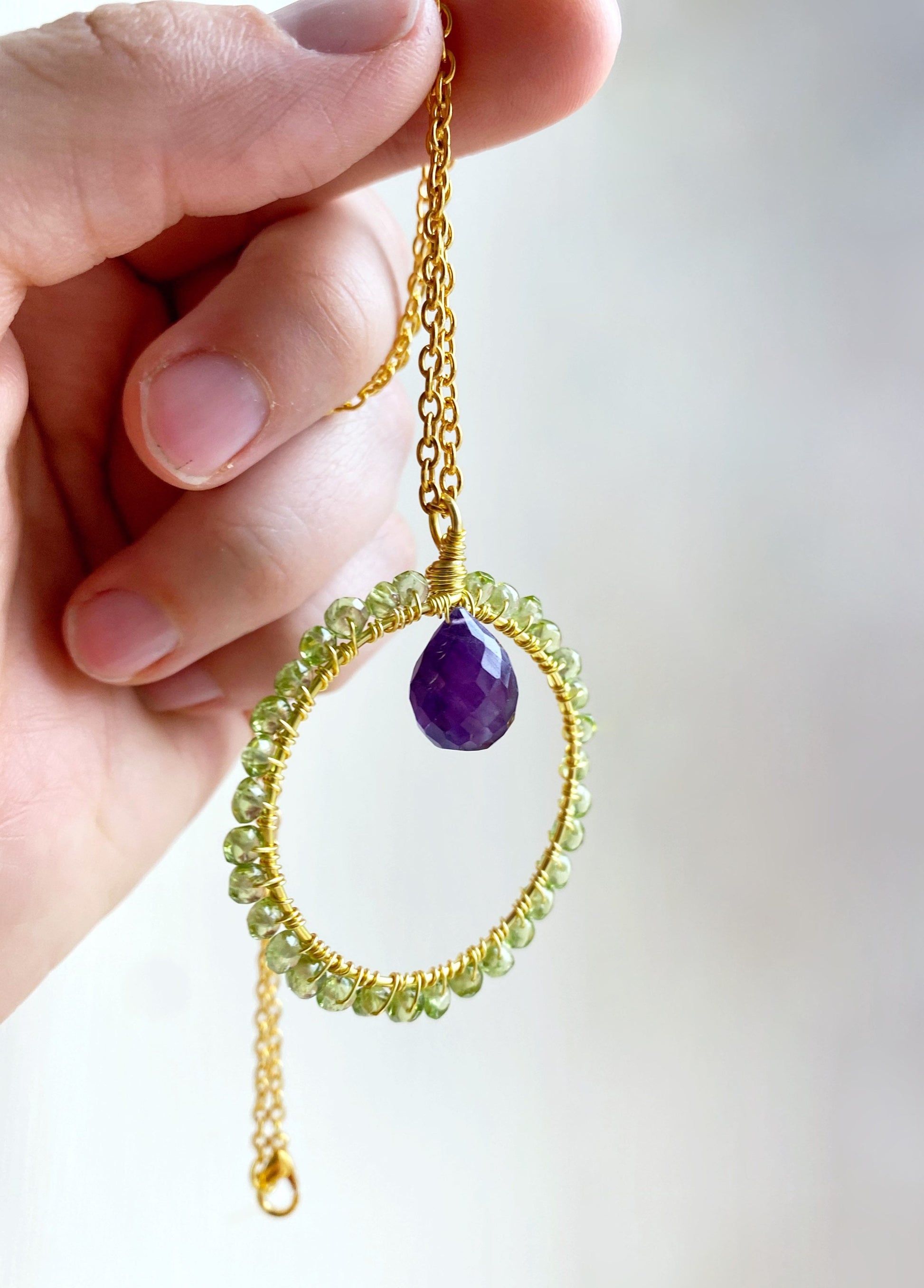 Gold Peridot necklace, Amethyst Necklace, August Birthstone Jewellery, Green stone Necklace, circle necklace, 16th wedding anniversary gift