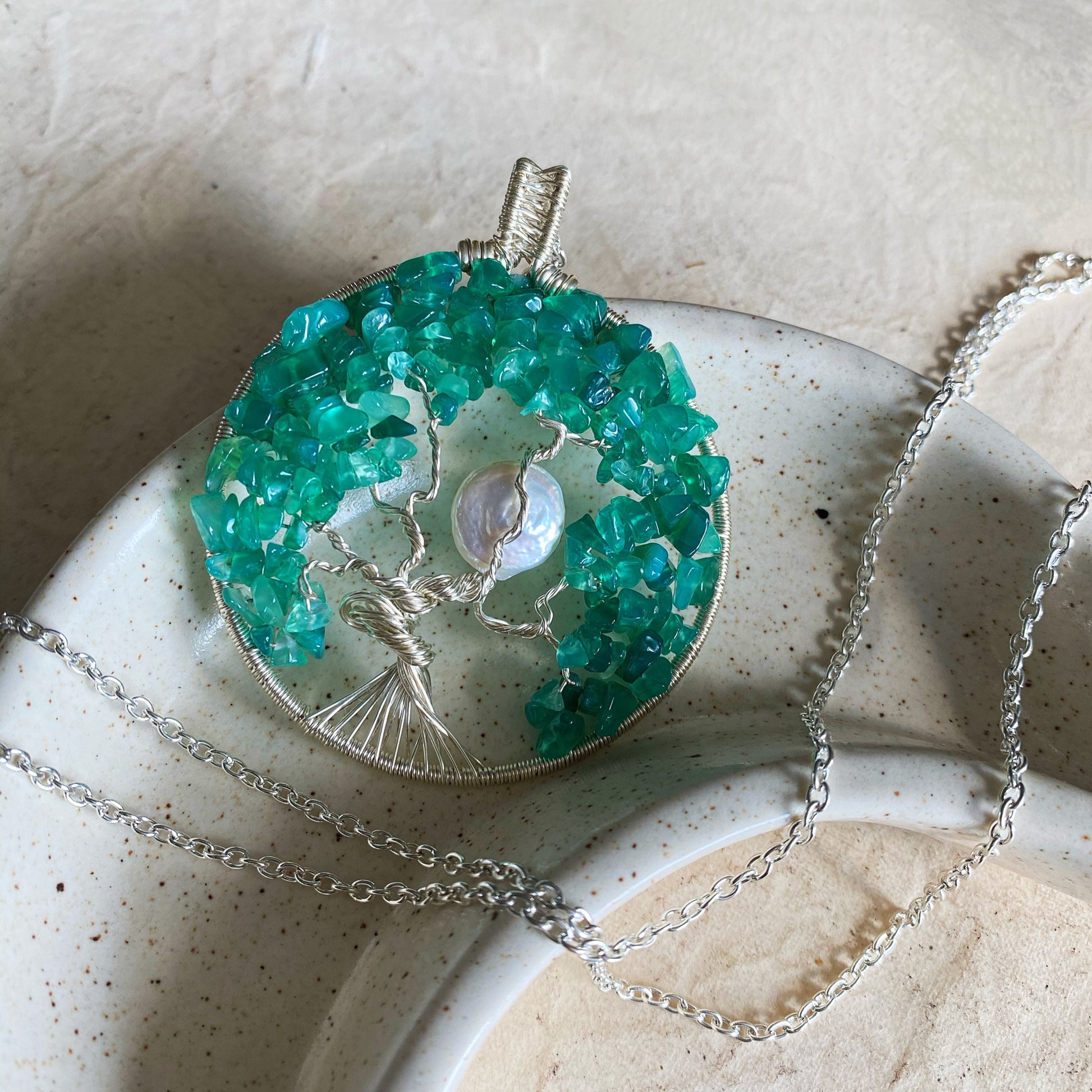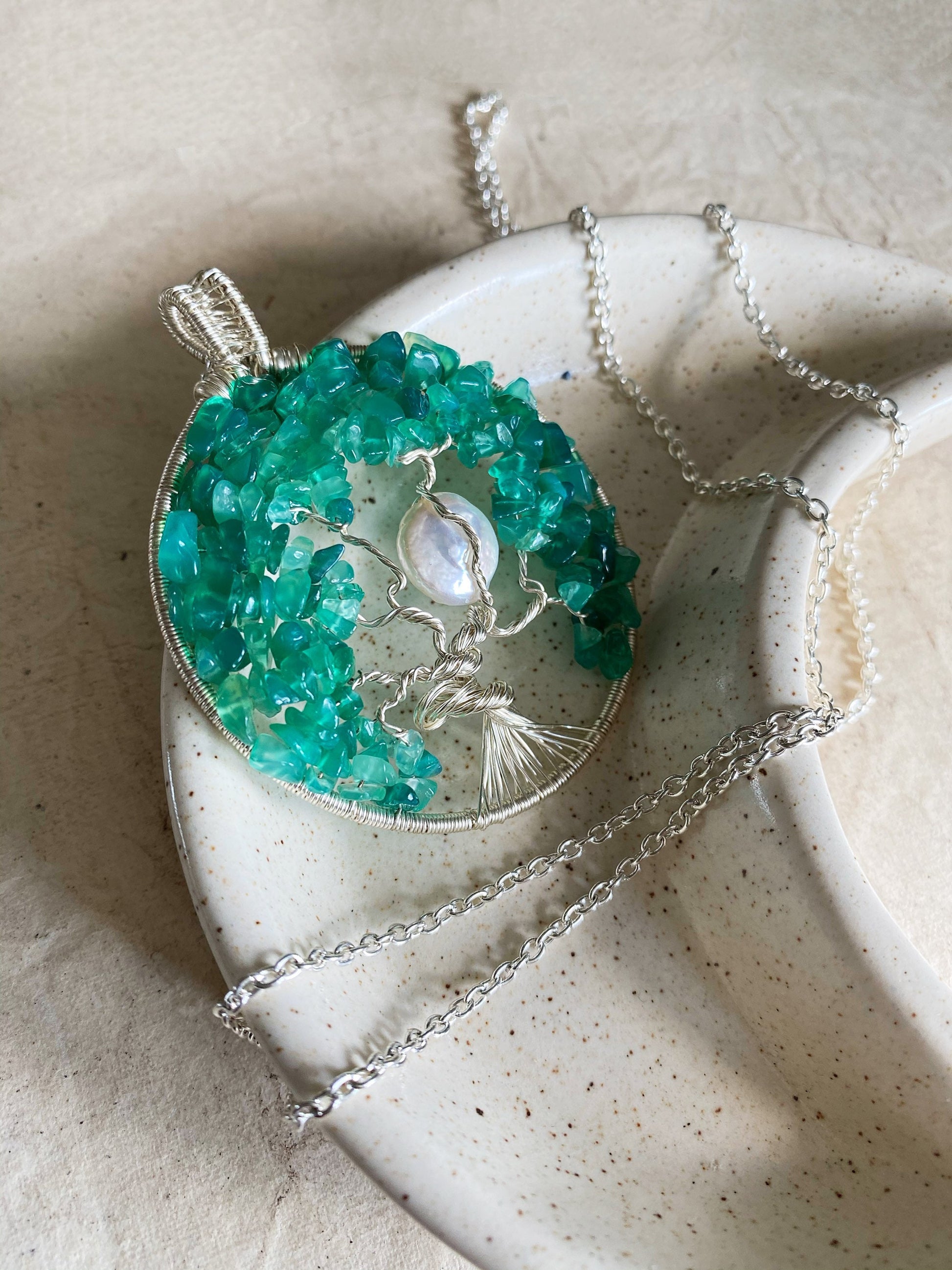 Beautiful and delicate green onyx tree of life design in 925 silver plated wire accented with a cultured pearl coin moon.