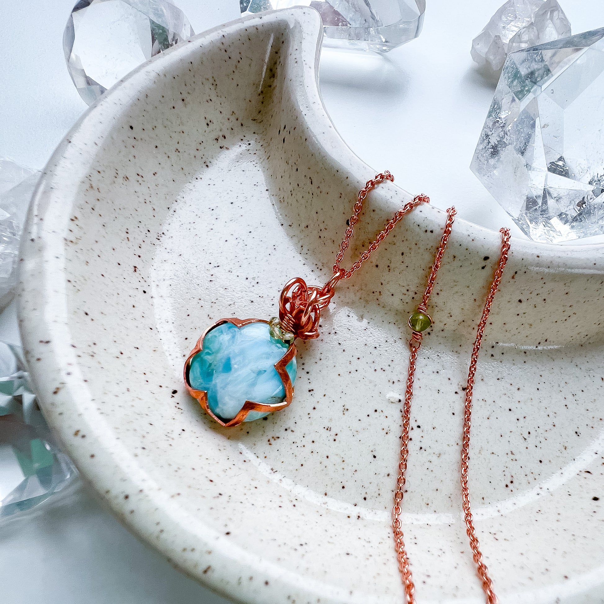 Combining the larimar with amazonite and peridot crystals in this necklace can offer a range of benefits.
