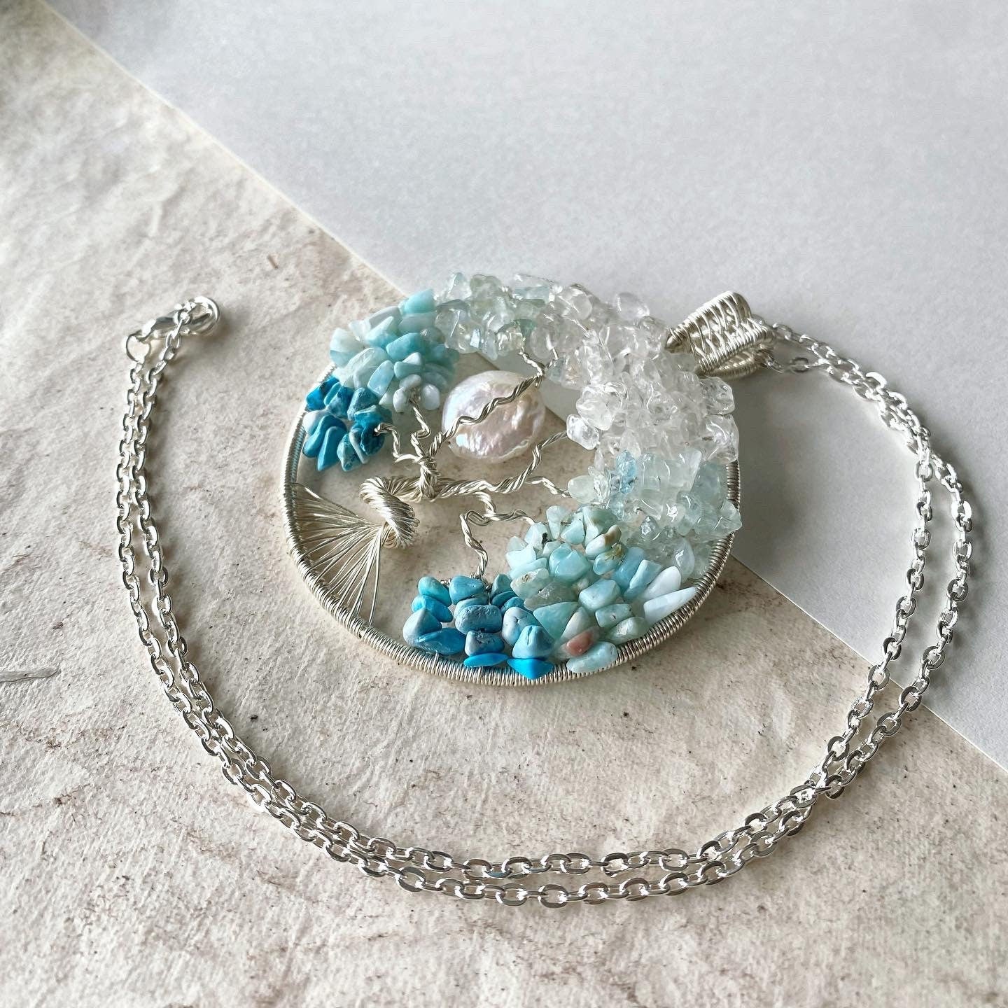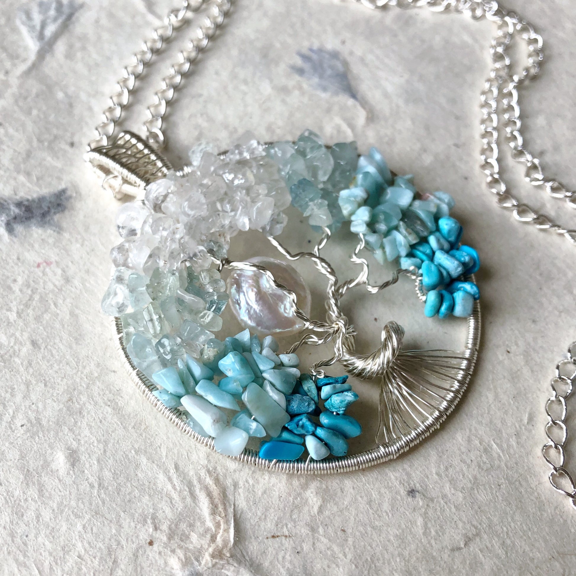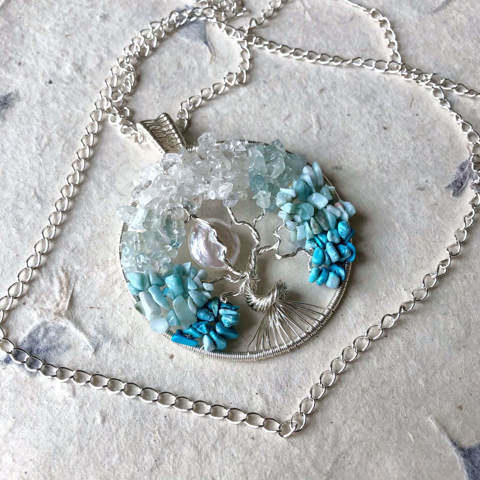Beautiful and delicate tree of life design in 925 silver plated wire accented with a cultured pearl coin moon and made using beautiful natural white topaz, aquamarine, larimar and turquoise gemstone nuggets.