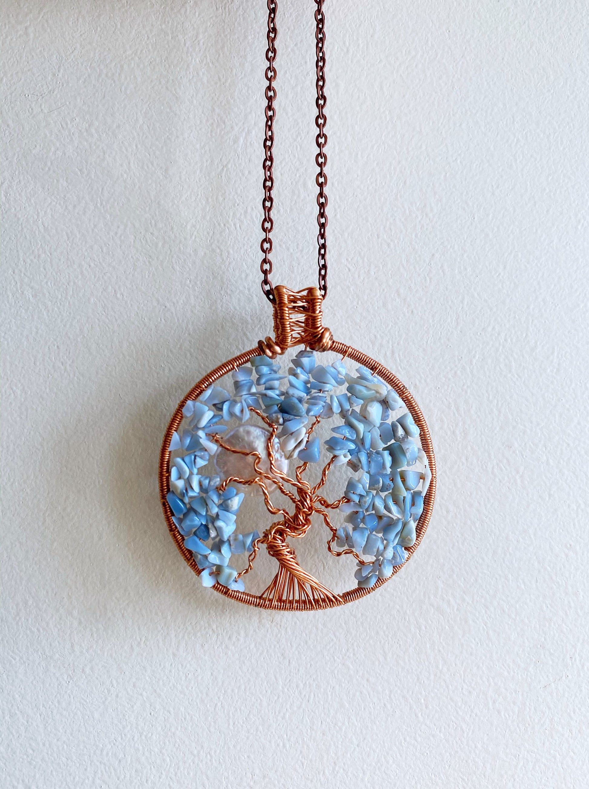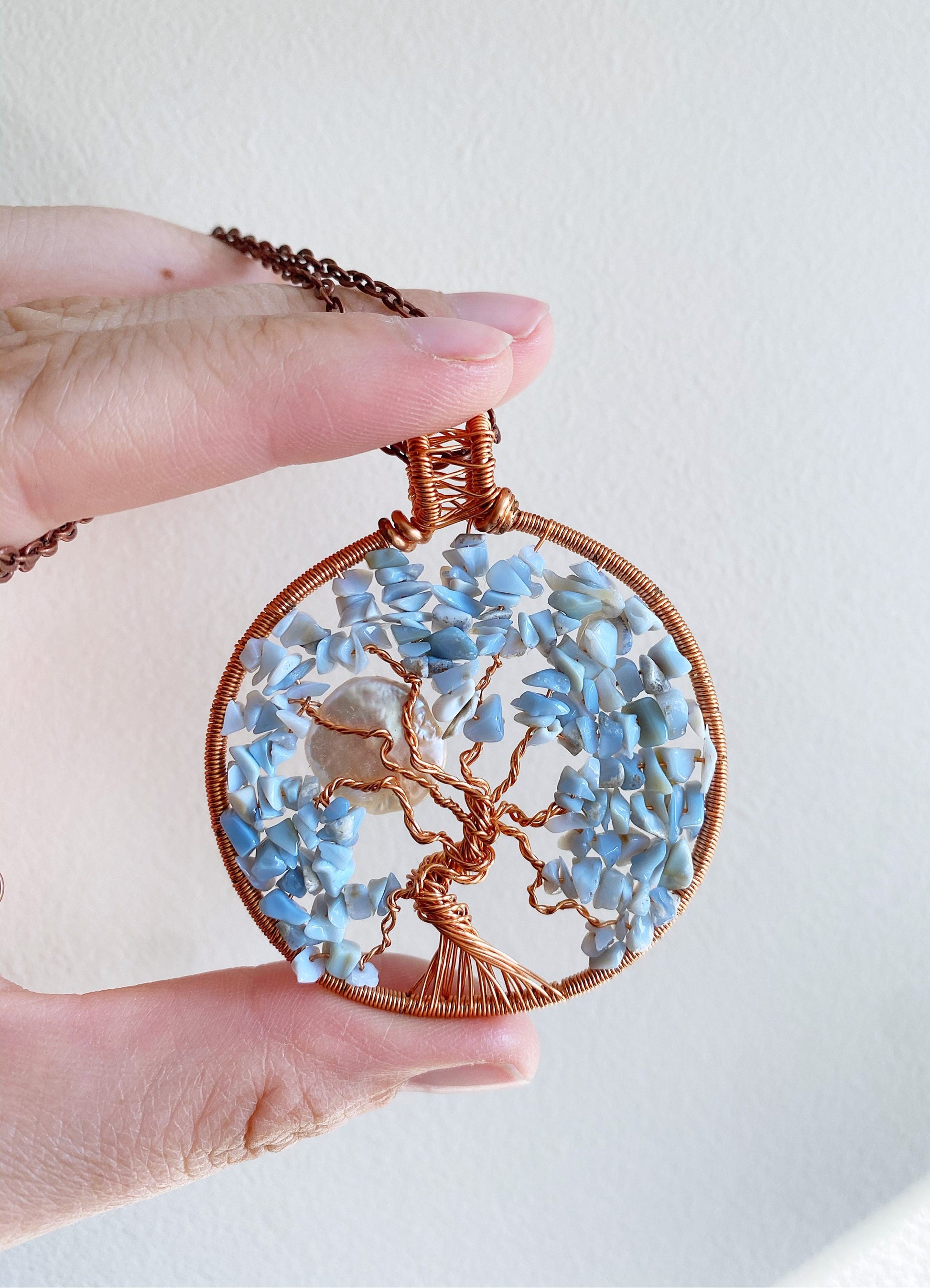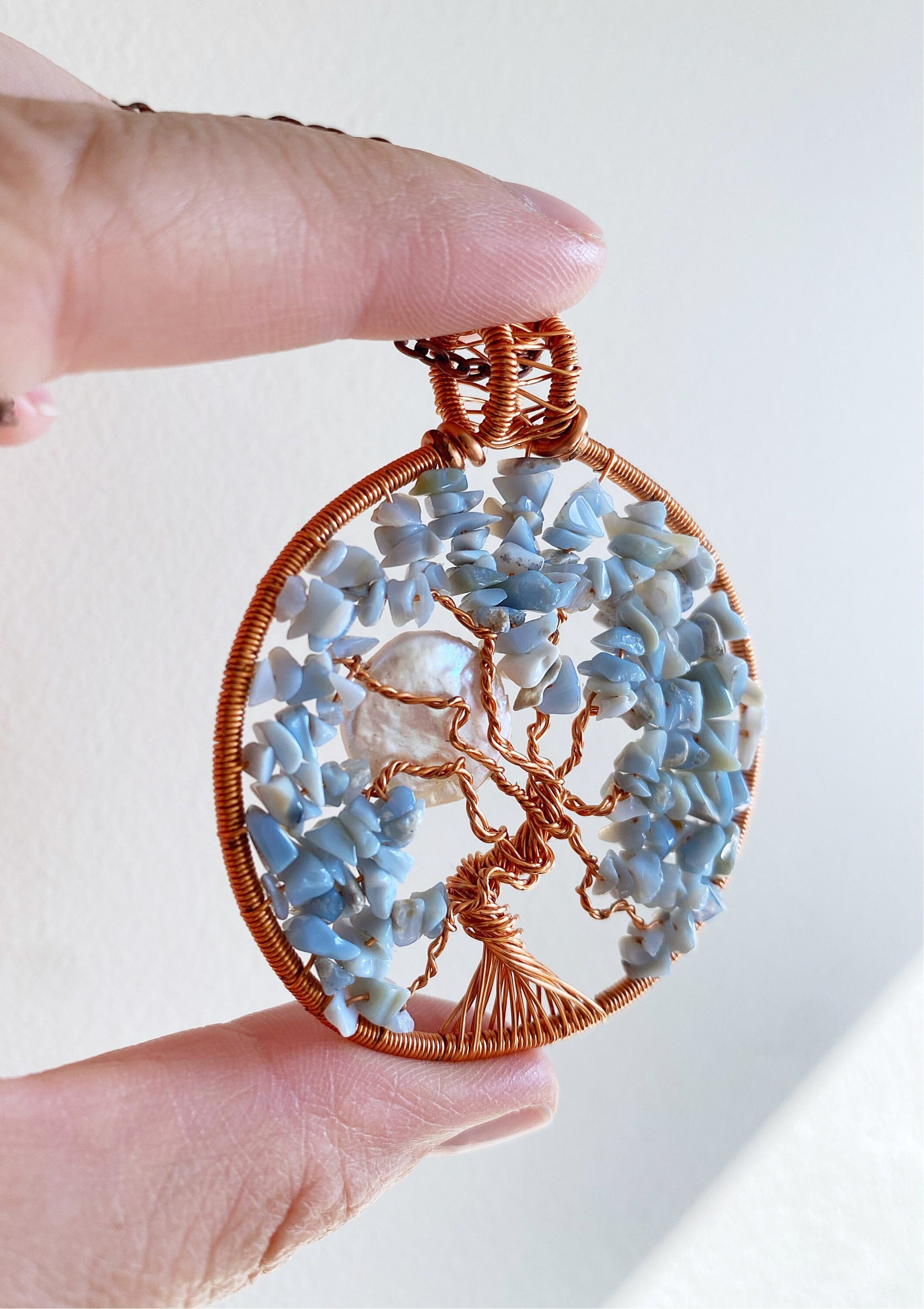I had so much fun making this wire woven ornate tree of life pendant using genuine natural blue opal nuggets with an ivory pearl representing the moon and wrapped in copper coloured wire.