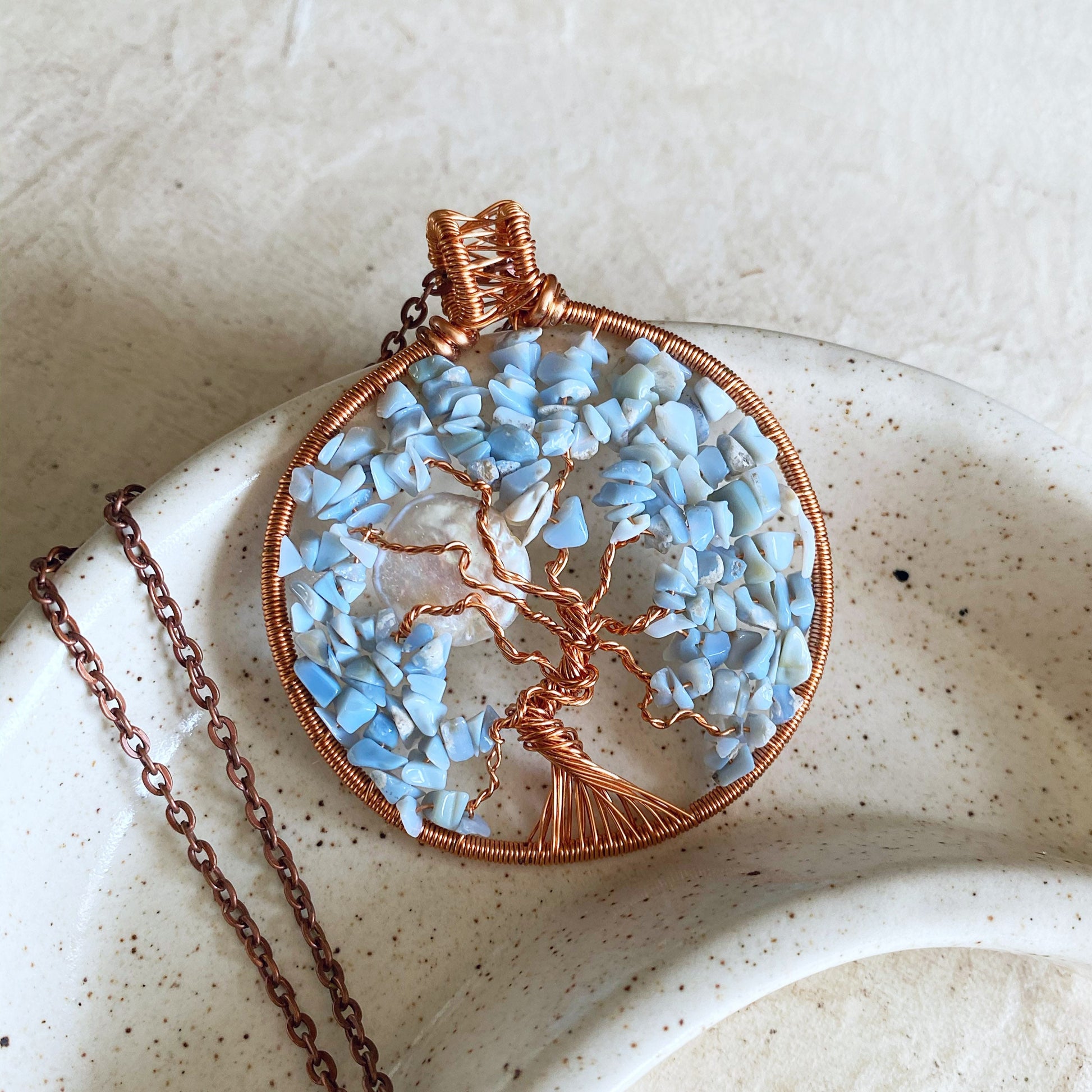 Natural Blue Opal Tree of Life Necklace, Luxury Statement Gift for Her, Blue opal necklace, October birthstone gift, throat chakra pendant