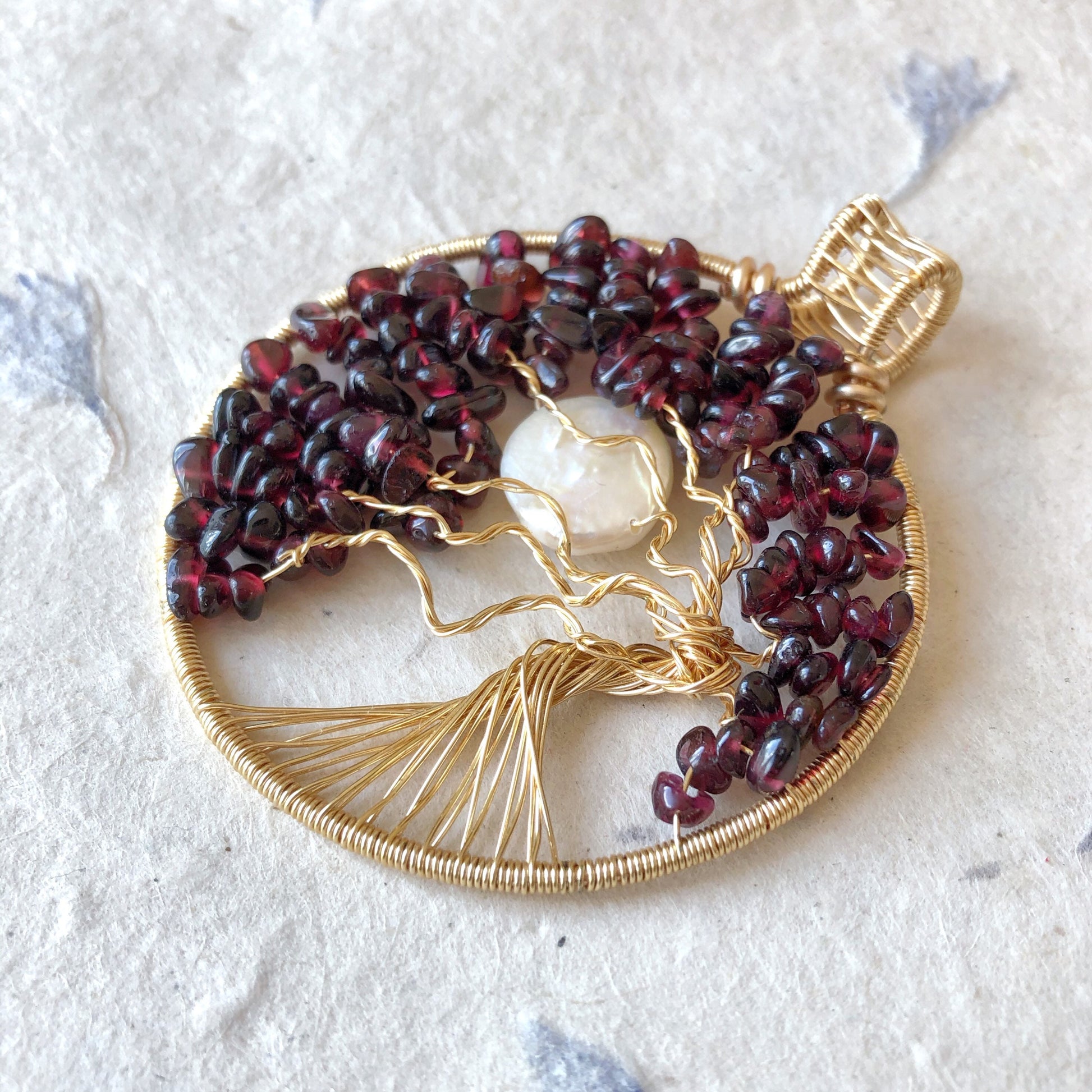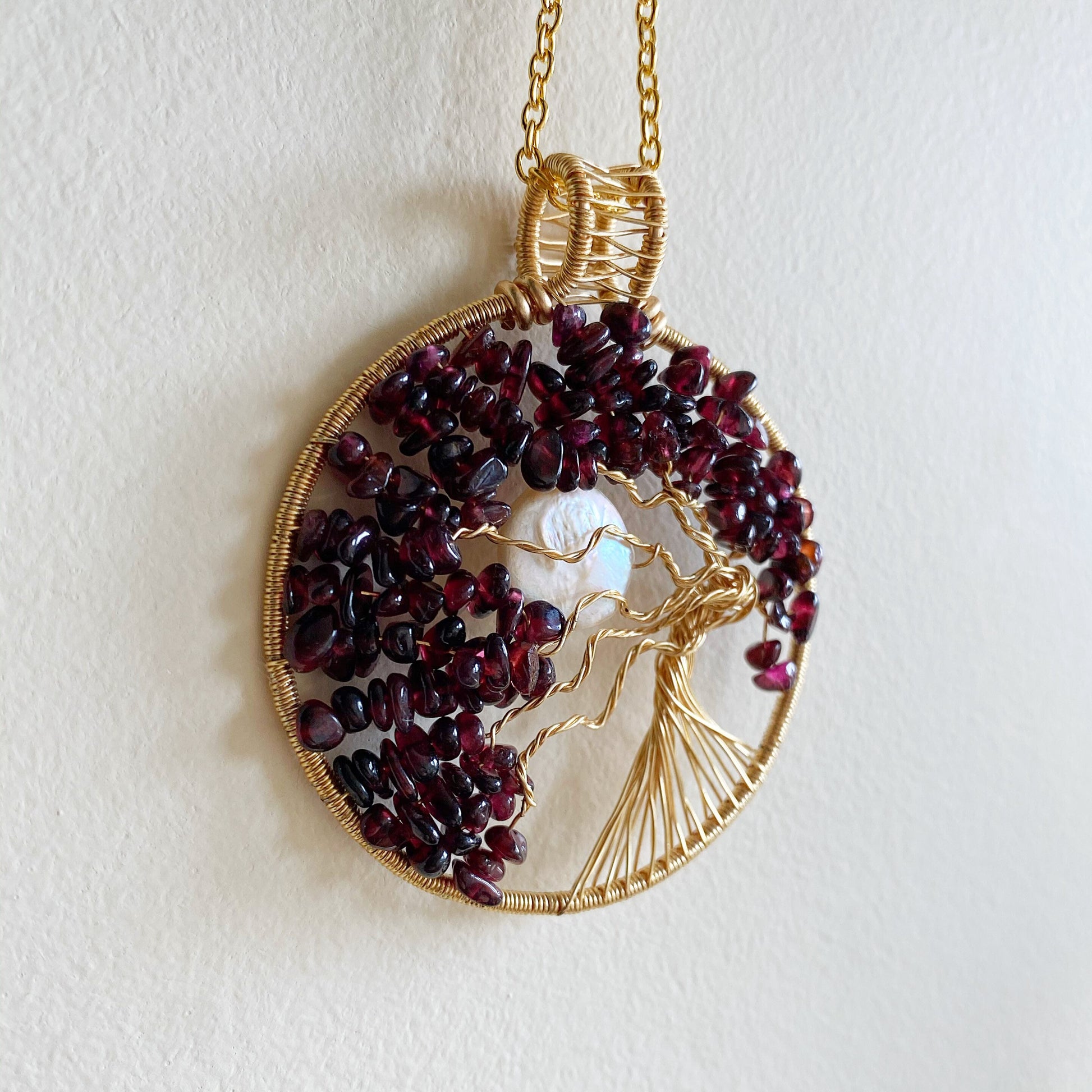 Gorgeous, rich red berry colour garnet tree of life design in champagne gold accented with a cultured pearl coin moon.