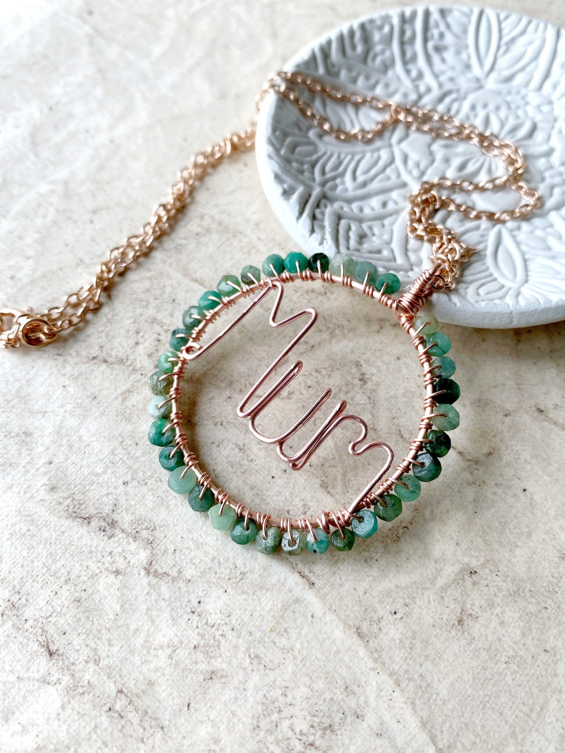 Details - - Emerald beads - Rose colour wire - Rose colour 18” chain - Pendant measures approximately 45x50mm