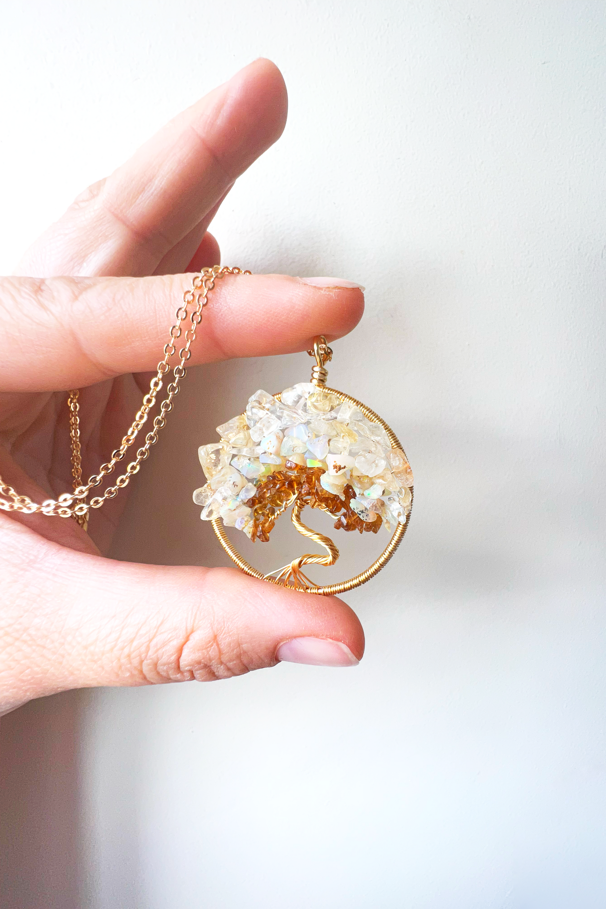This stunning necklace features a tree of life design and is created with Ethiopian opal and Hessonite garnet.