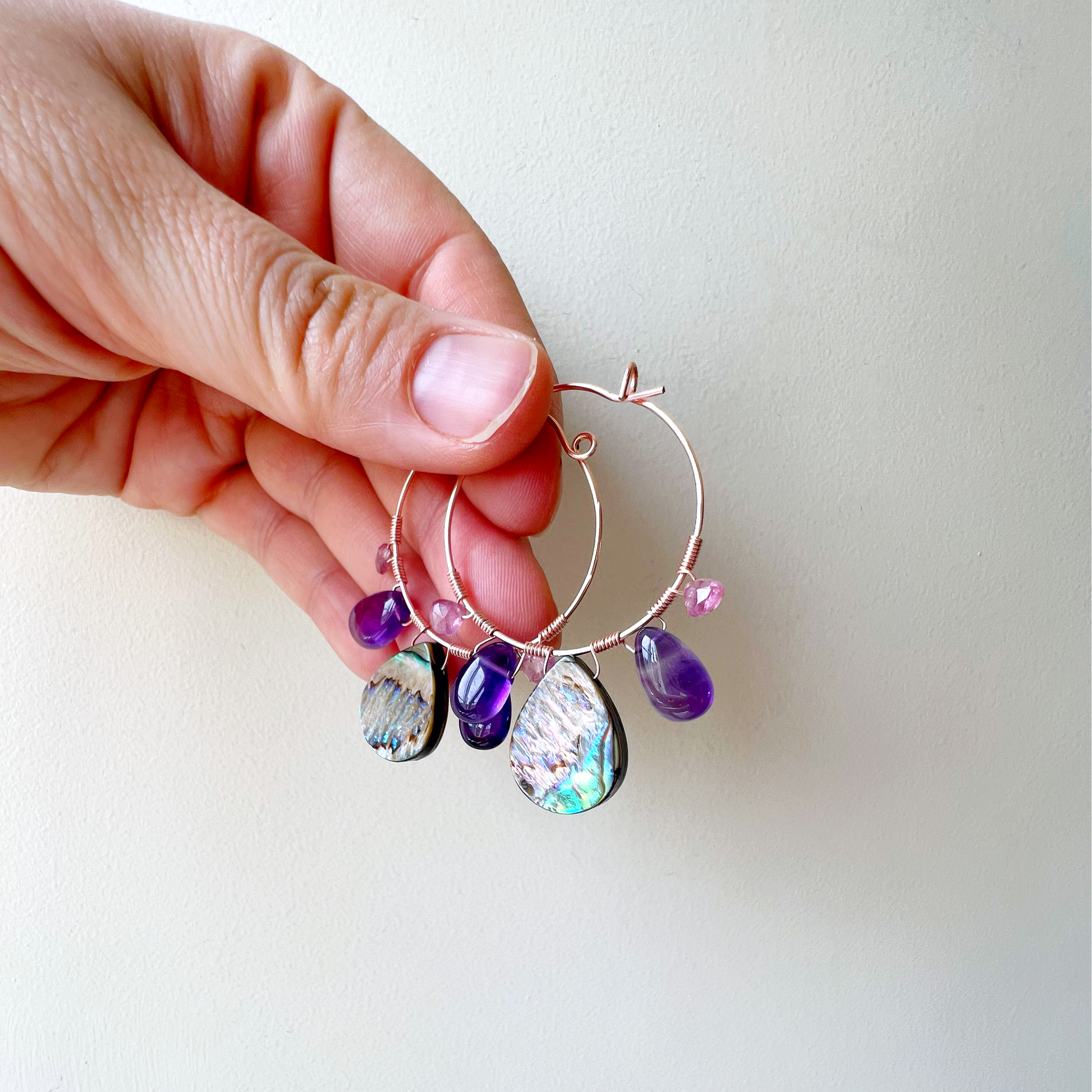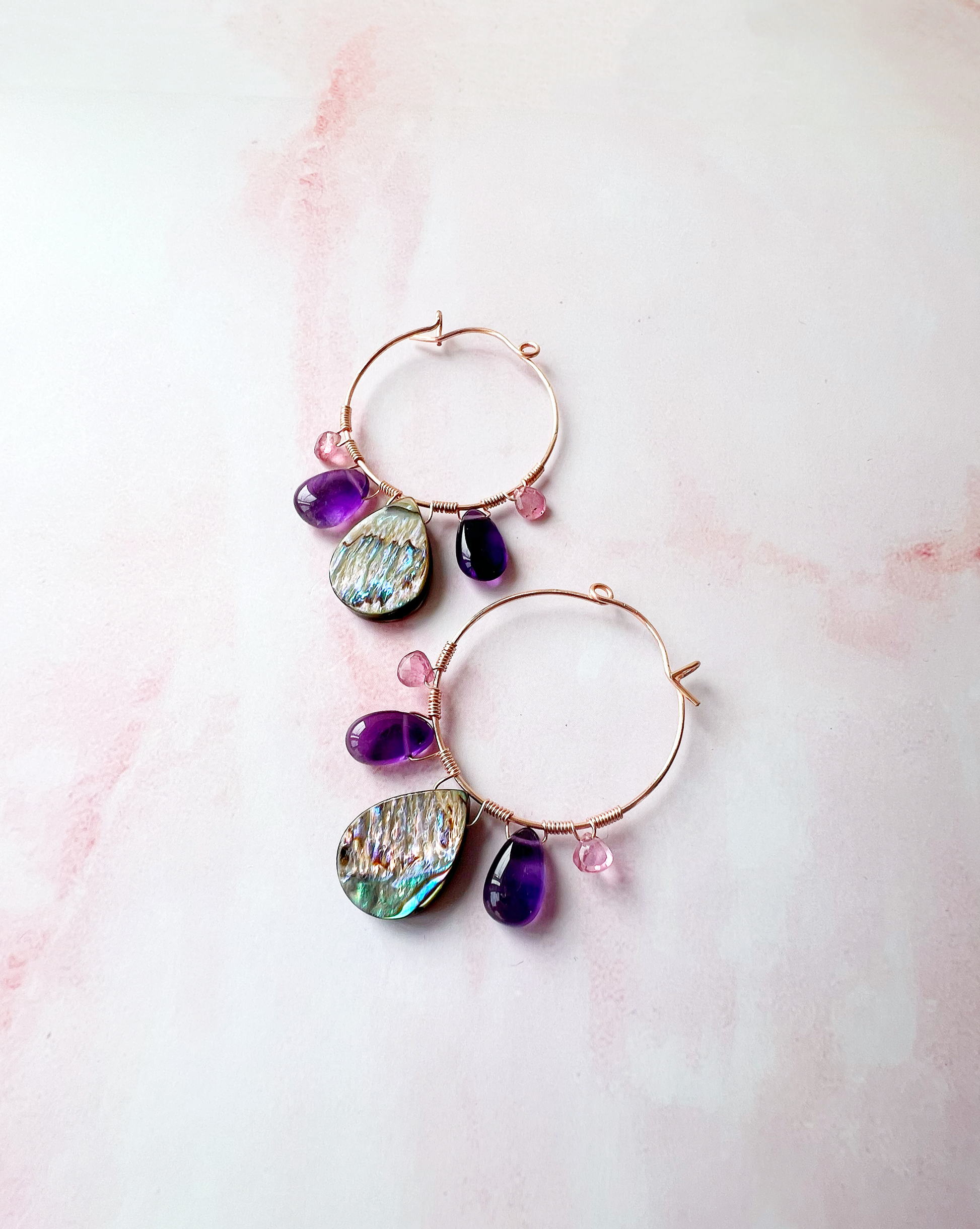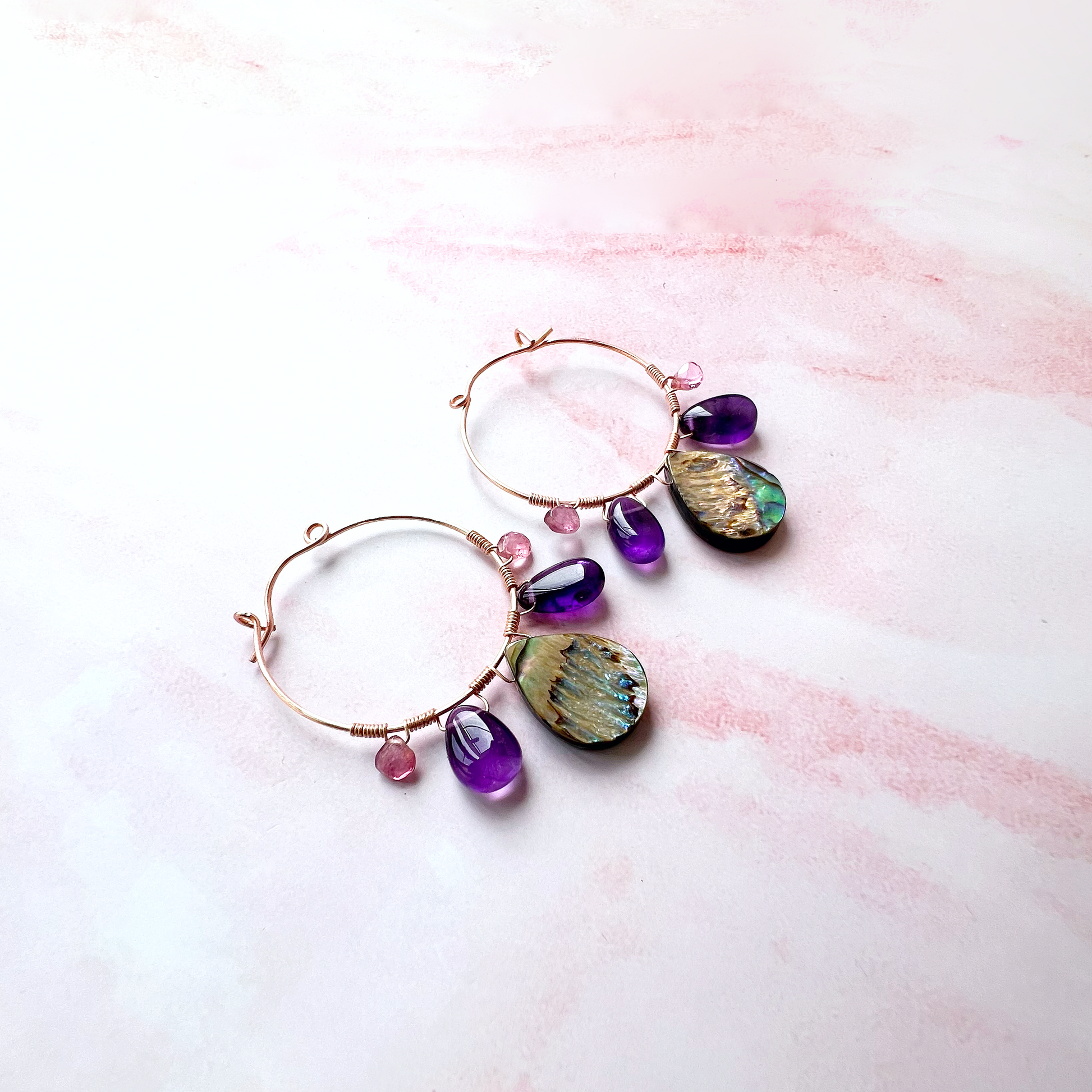 Paua shell earrings, Abalone earrings, pink shell jewellery, Pink tourmaline earrings, amethyst crystal hoop, Amethyst earrings