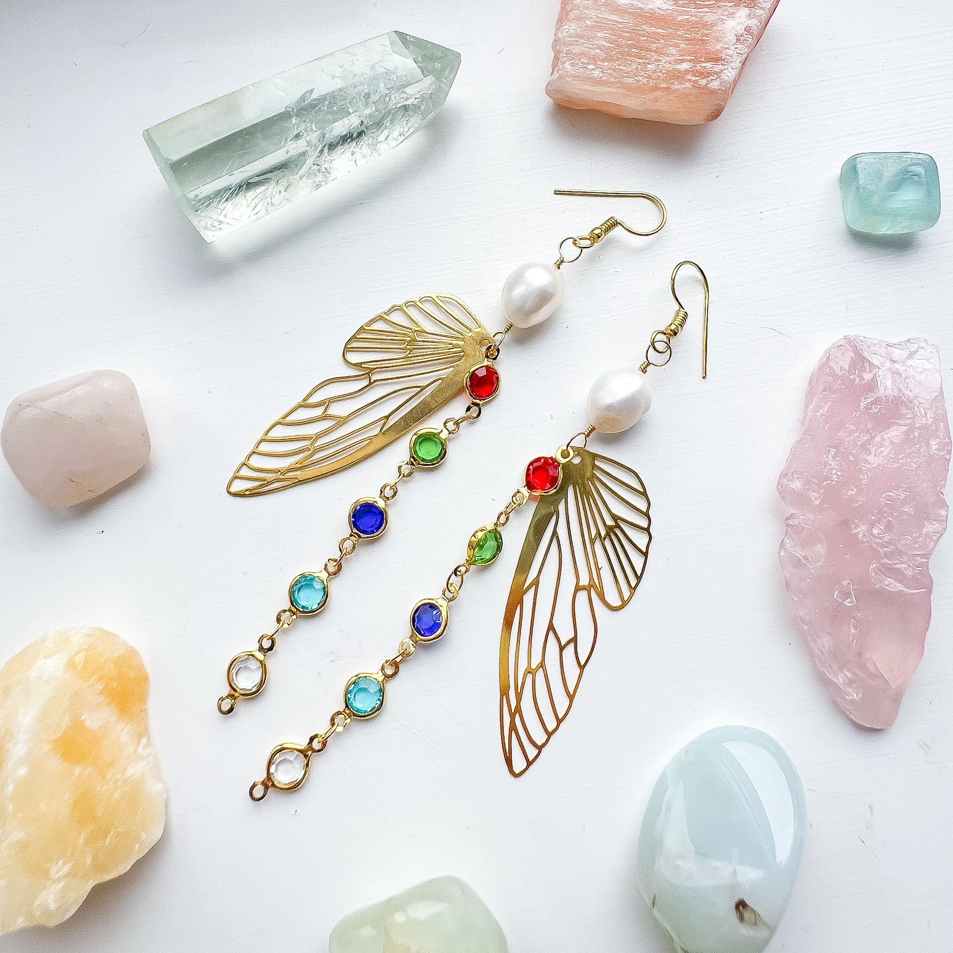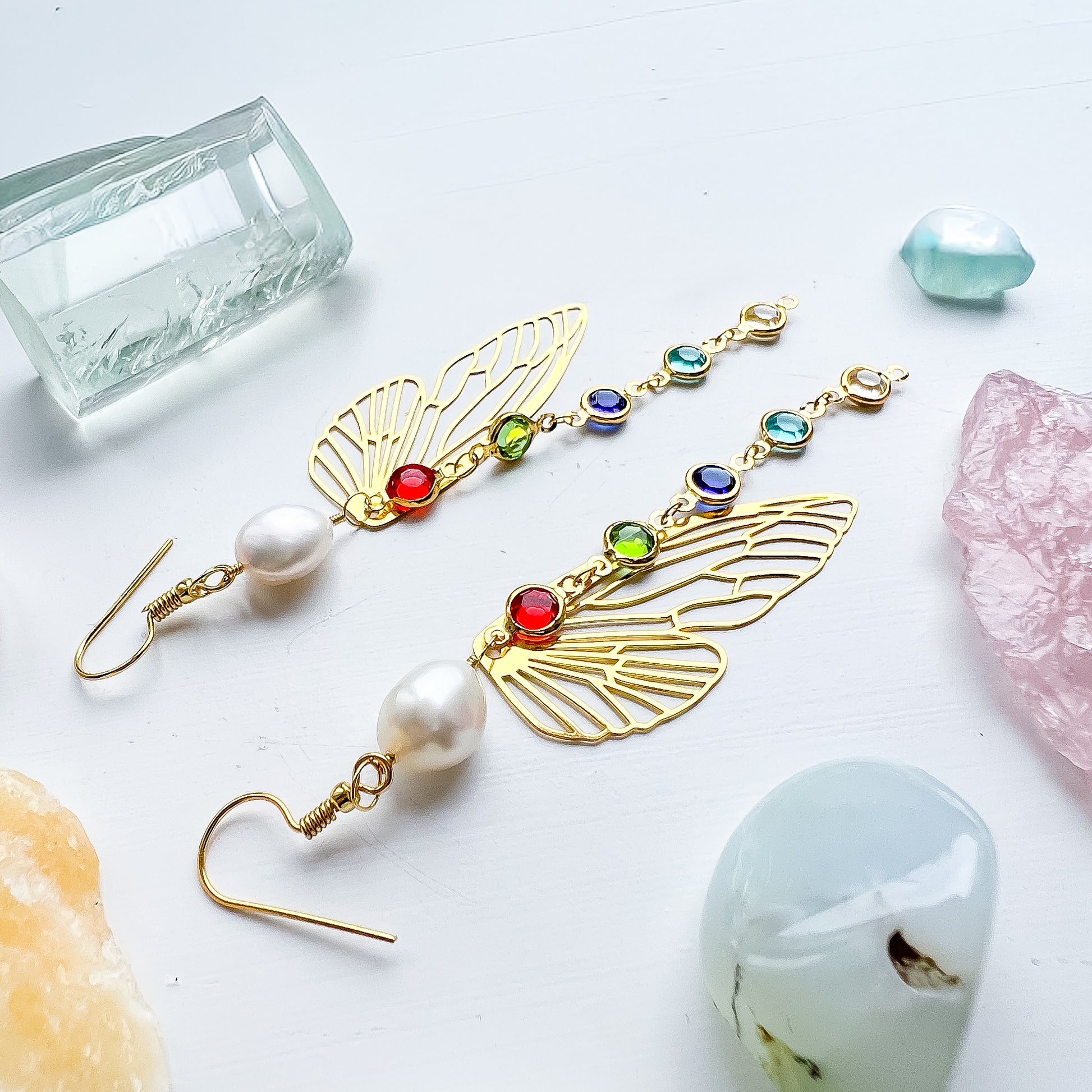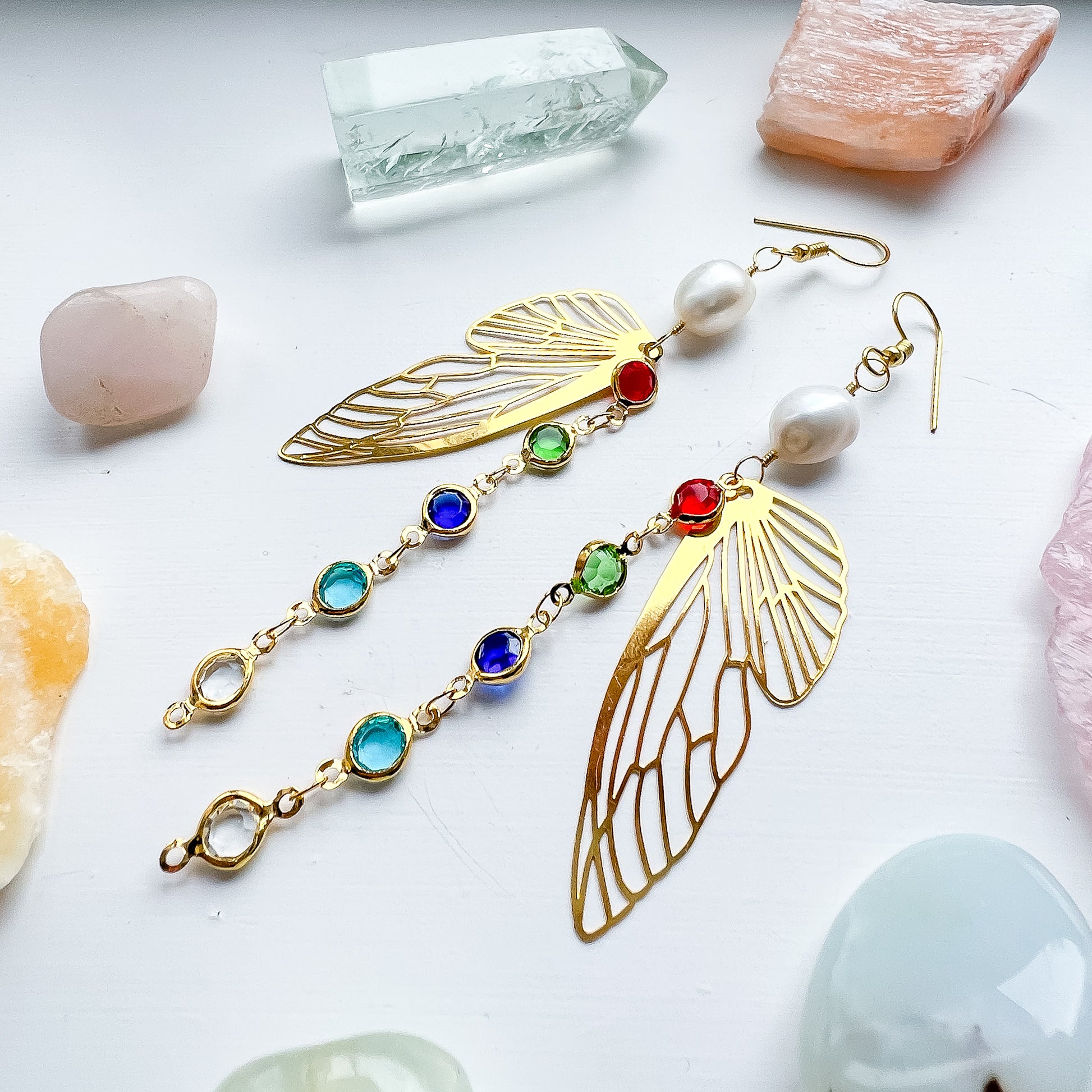 These joyful, lightweight earrings feature ethically sourced pearls, delicate gold-plated wing charms, and a cascade of multi-coloured crystals set in warm gold-toned frames. The mix of metals gives them a playful, modern feel while the winged silhouette brings in a soft, ethereal vibe.