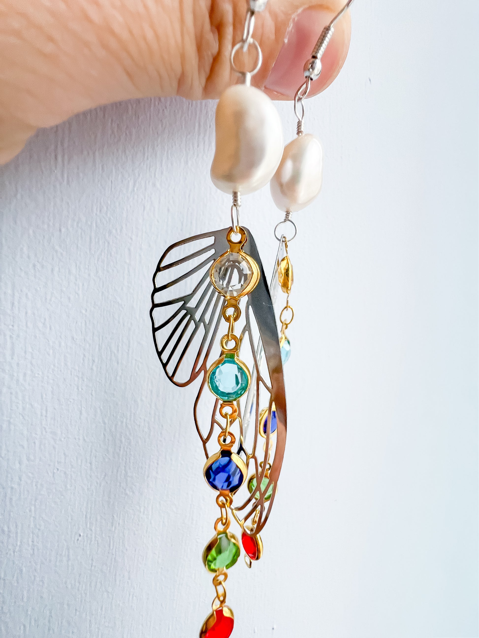Materials: Ethically sourced freshwater pearls, silver-plated wing charms, gold-framed faceted glass crystals, silver-plated ear hooks