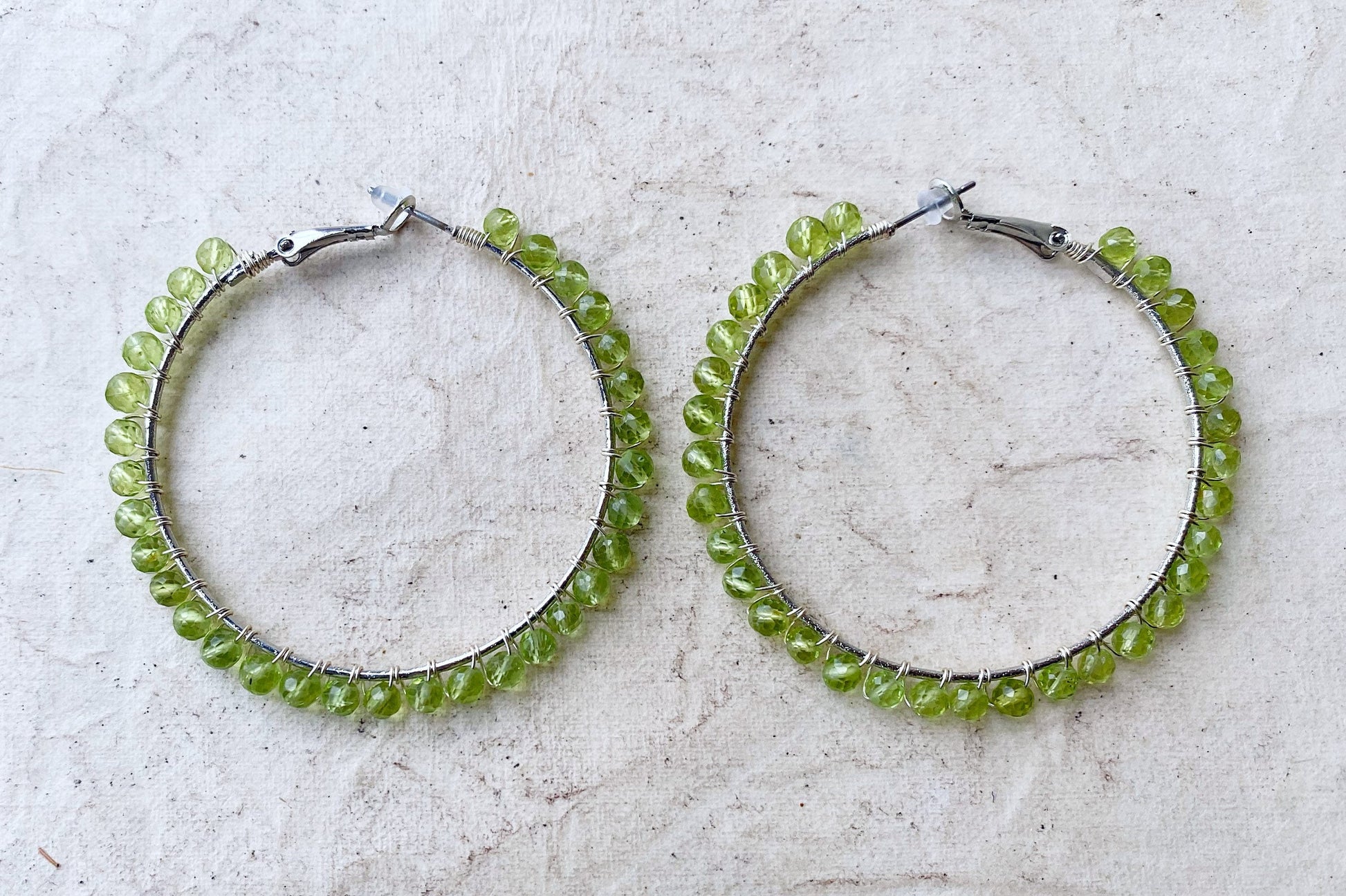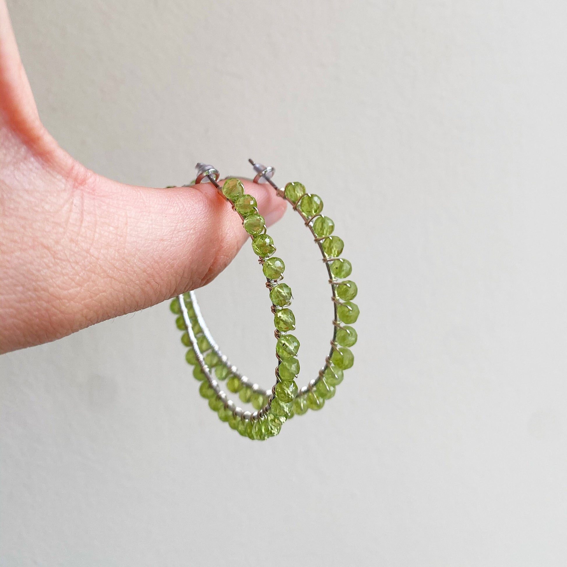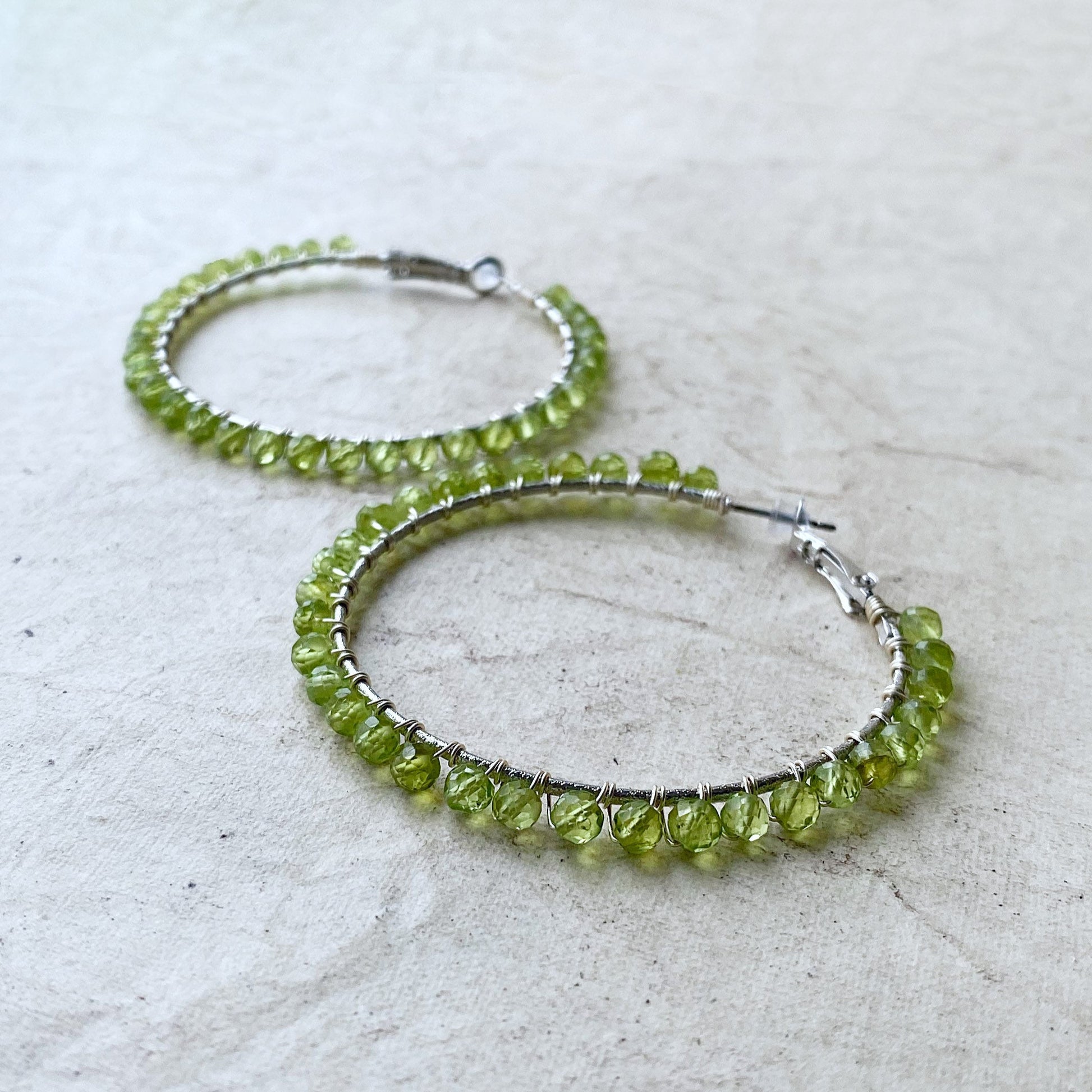 The peridot crystals complement the silver wire hoops perfectly.