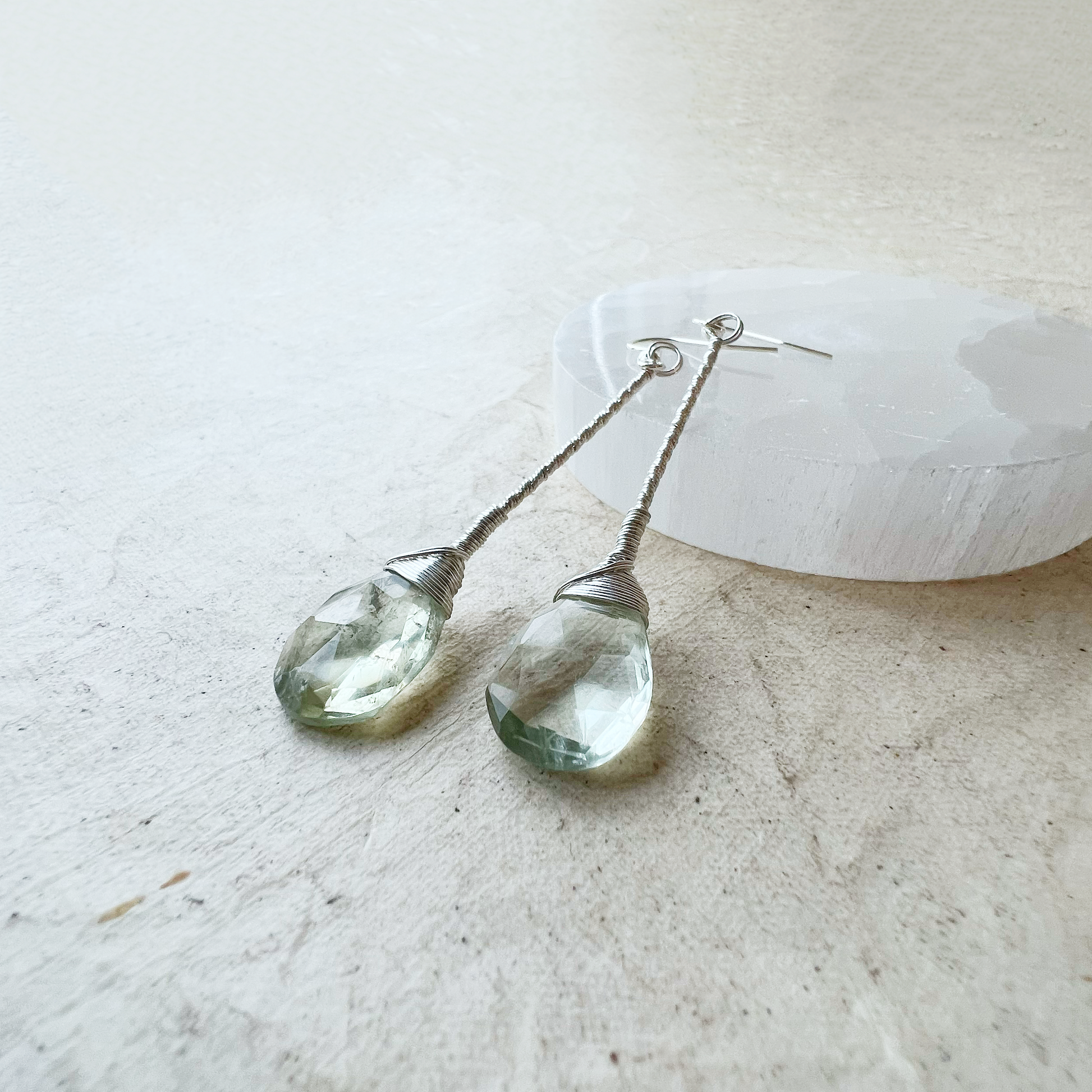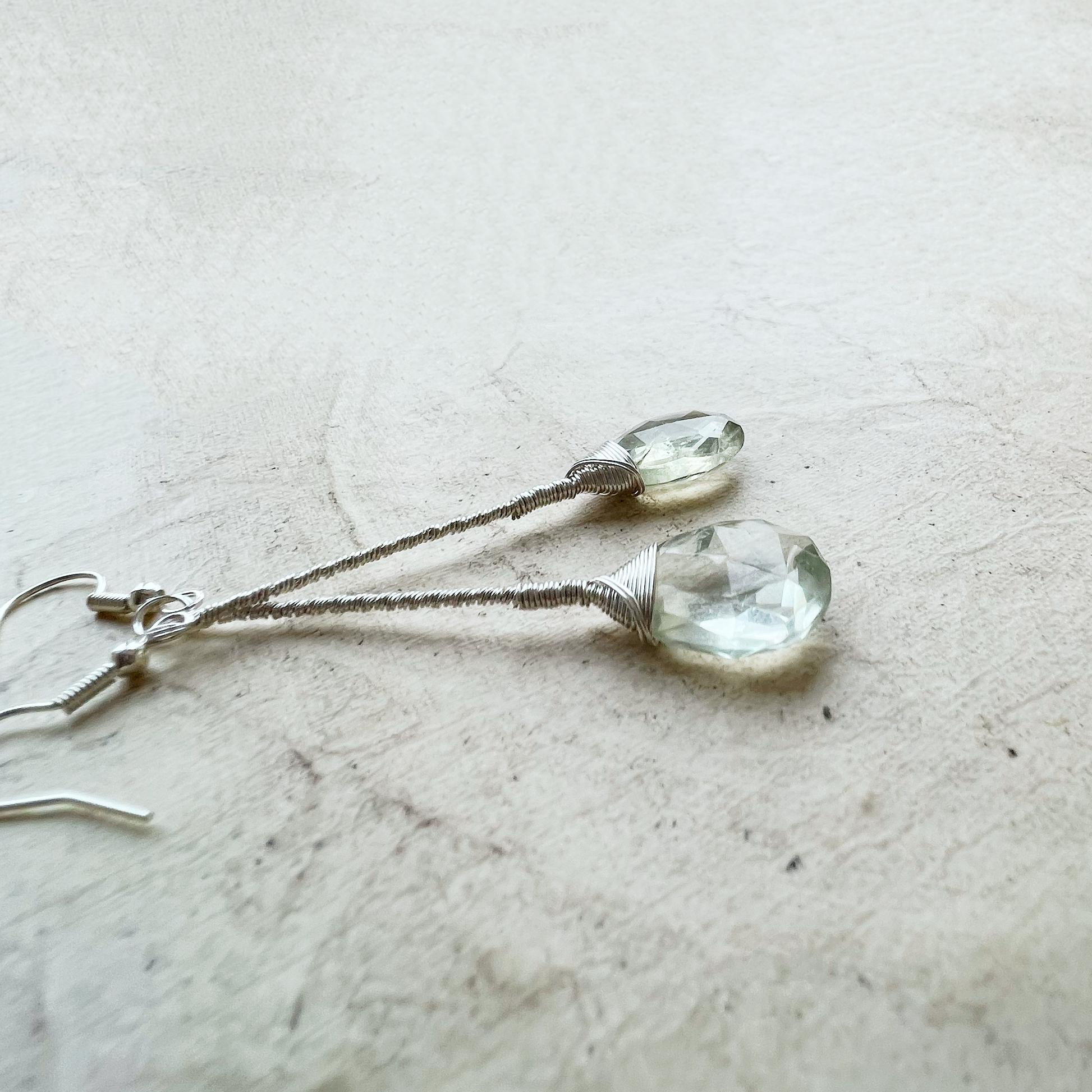 Gorgeous natural Prasiolite earrings with delicate silver colour wire work.