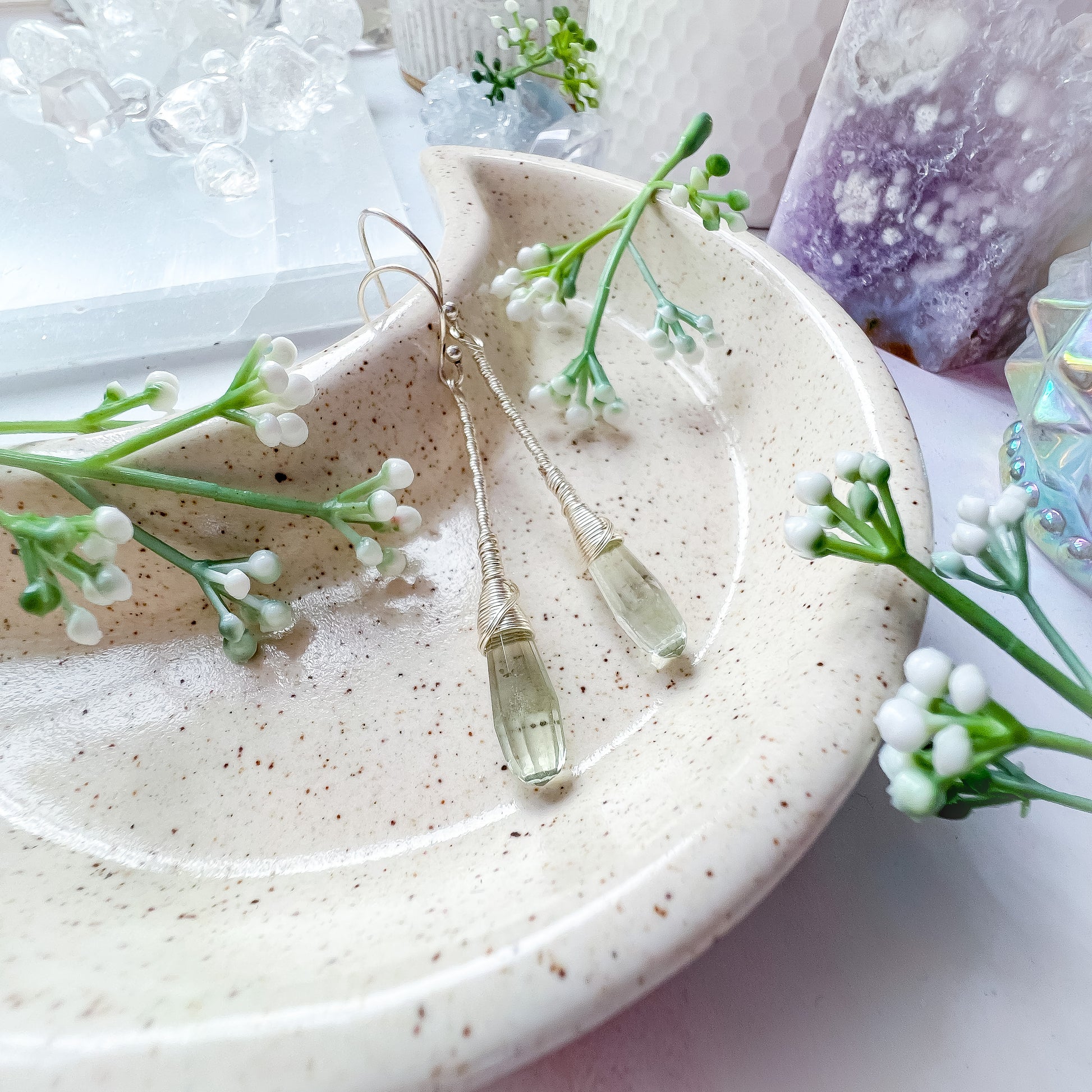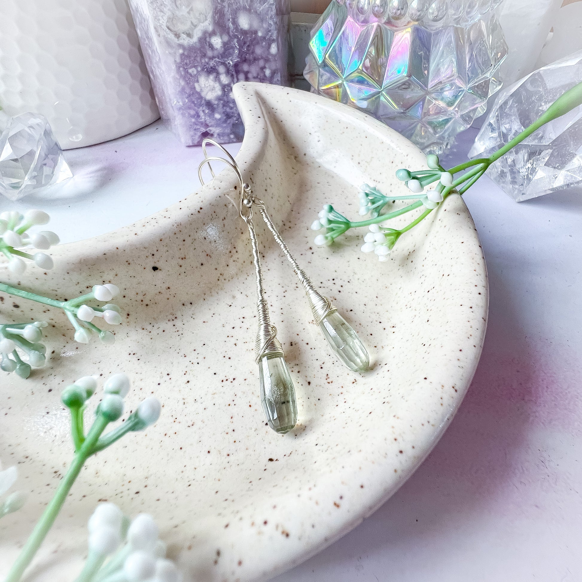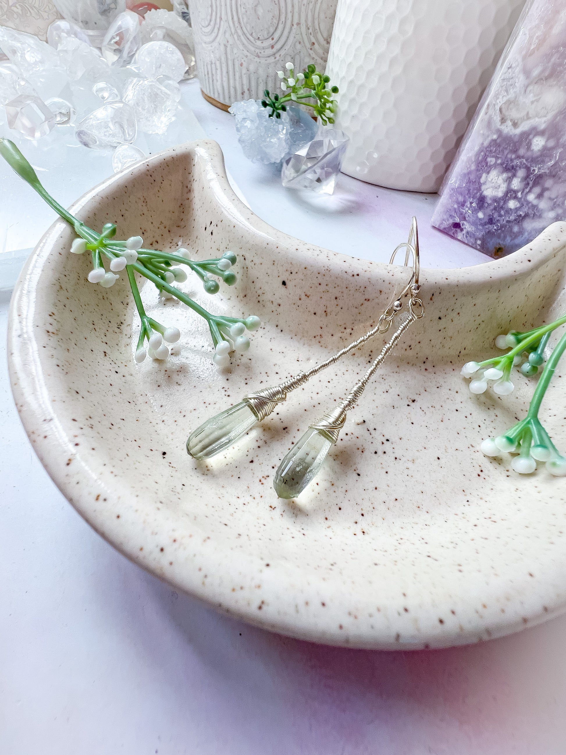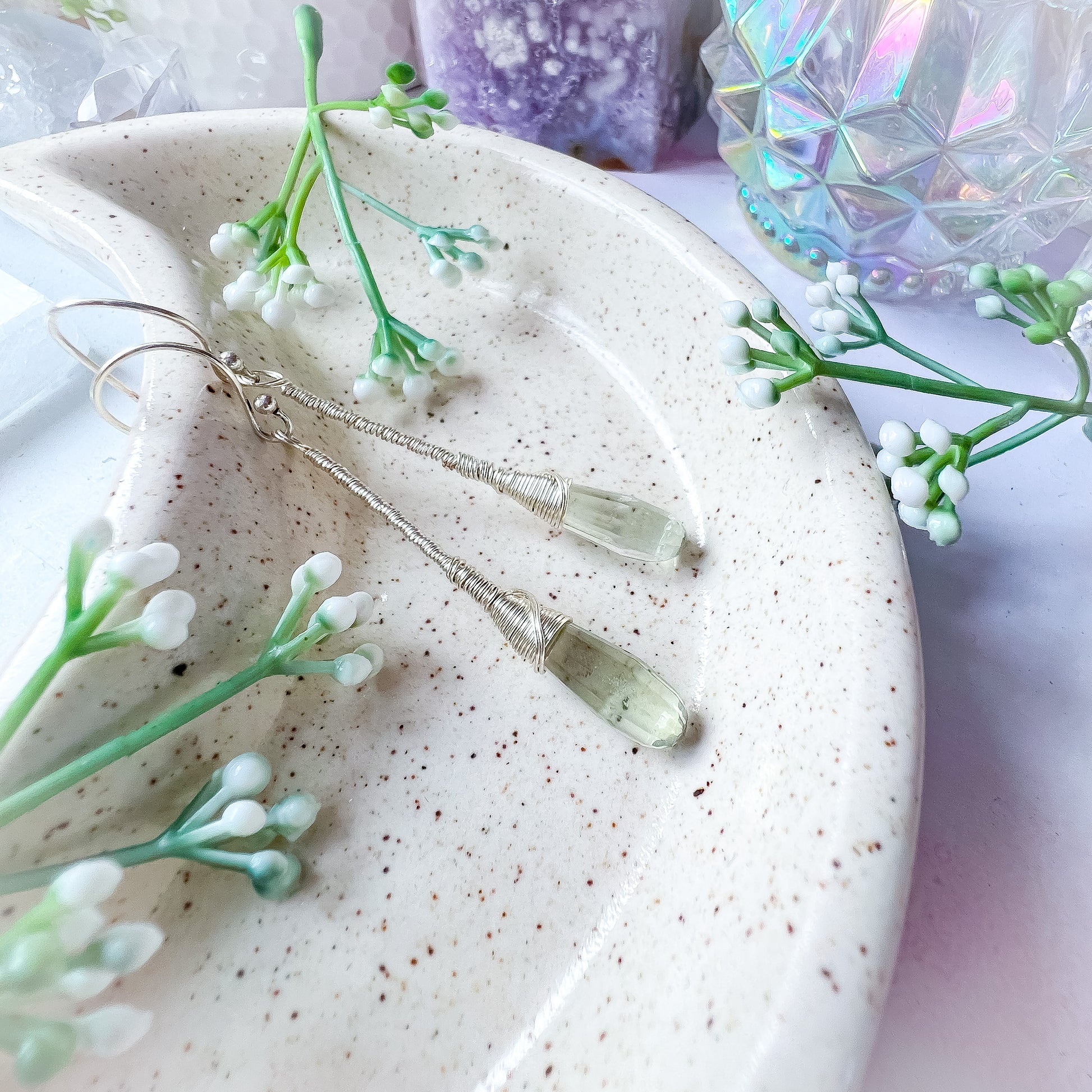 Gorgeous natural Prasiolite earrings with delicate silver colour wire work.