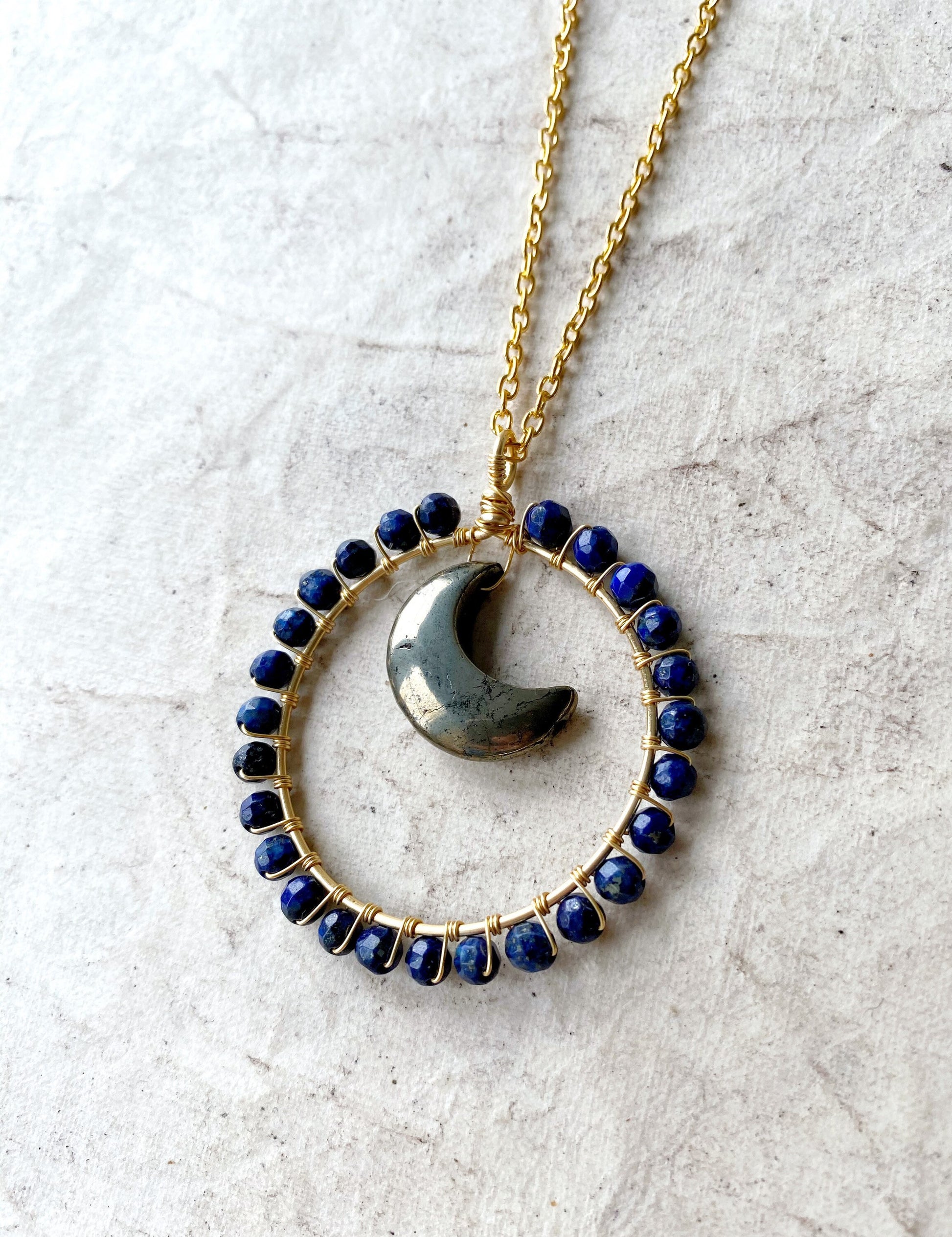 Pyrite crystal necklace, Lapis Lazuli necklace, Moon Gazer Pendant, Throat Chakra Jewelry, Sacral Chakra Jewellery, Gift for Stargazer