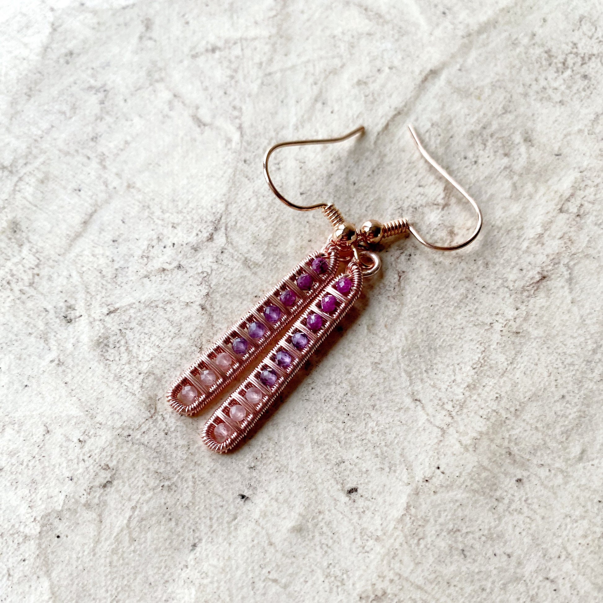 Beautiful natural rubies, amethysts and rose quartz micro faceted gemstone beads hand selected and meticulously wrapped in an ombré pattern in rose gold colour wire, elegant and perfect for every day.