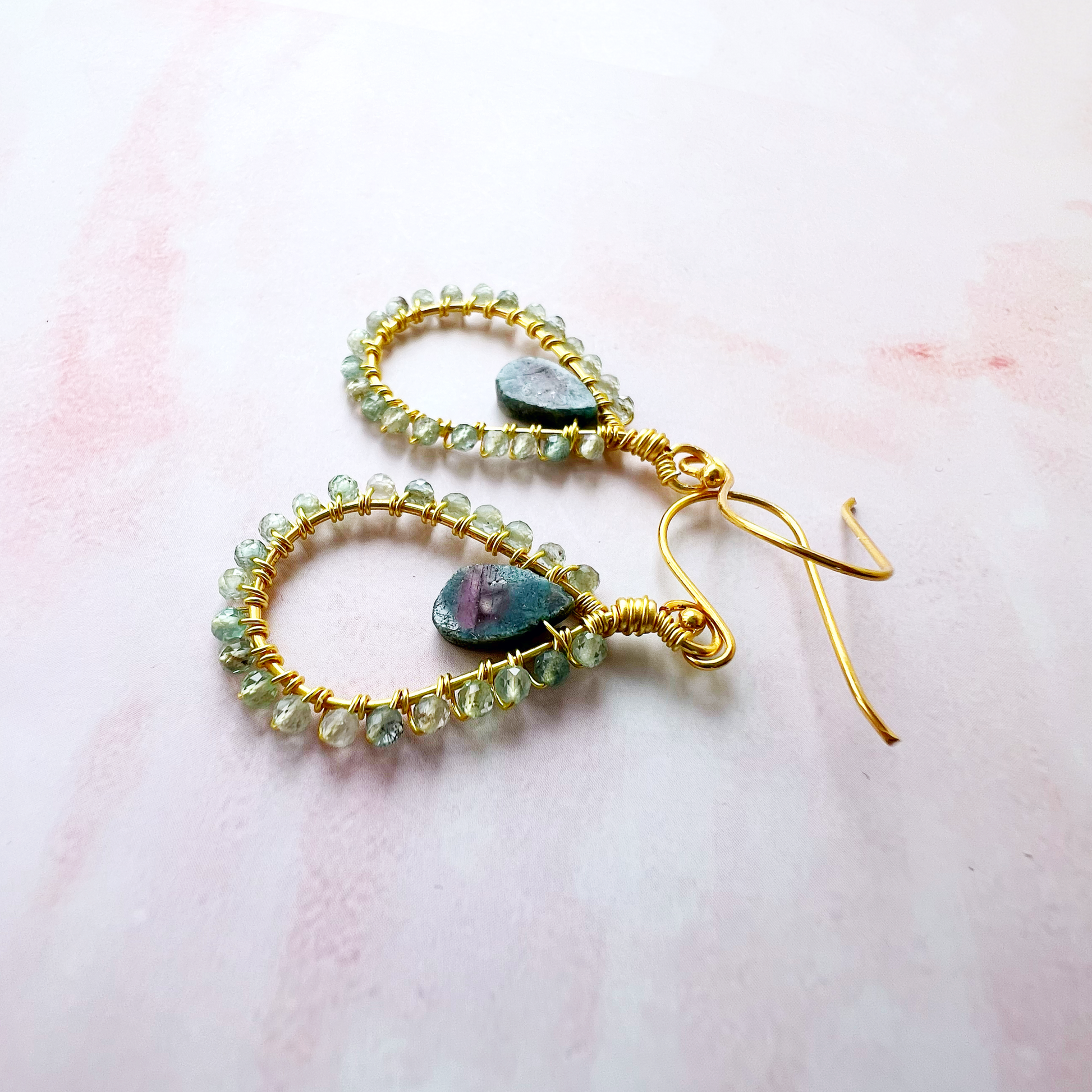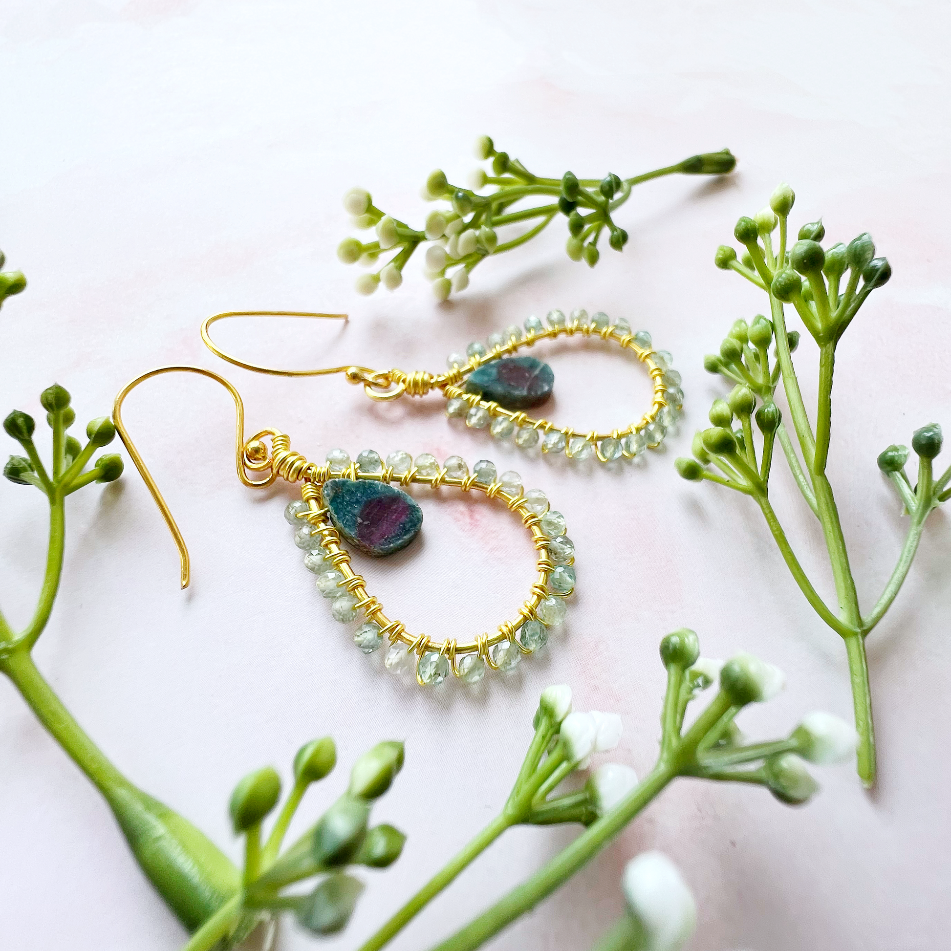 Ruby in Fuschite earrings, Gold gemstone earrings, Apatite Earrings, Tudor Queen jewellery, Date Night Jewellery, green crystal earrings