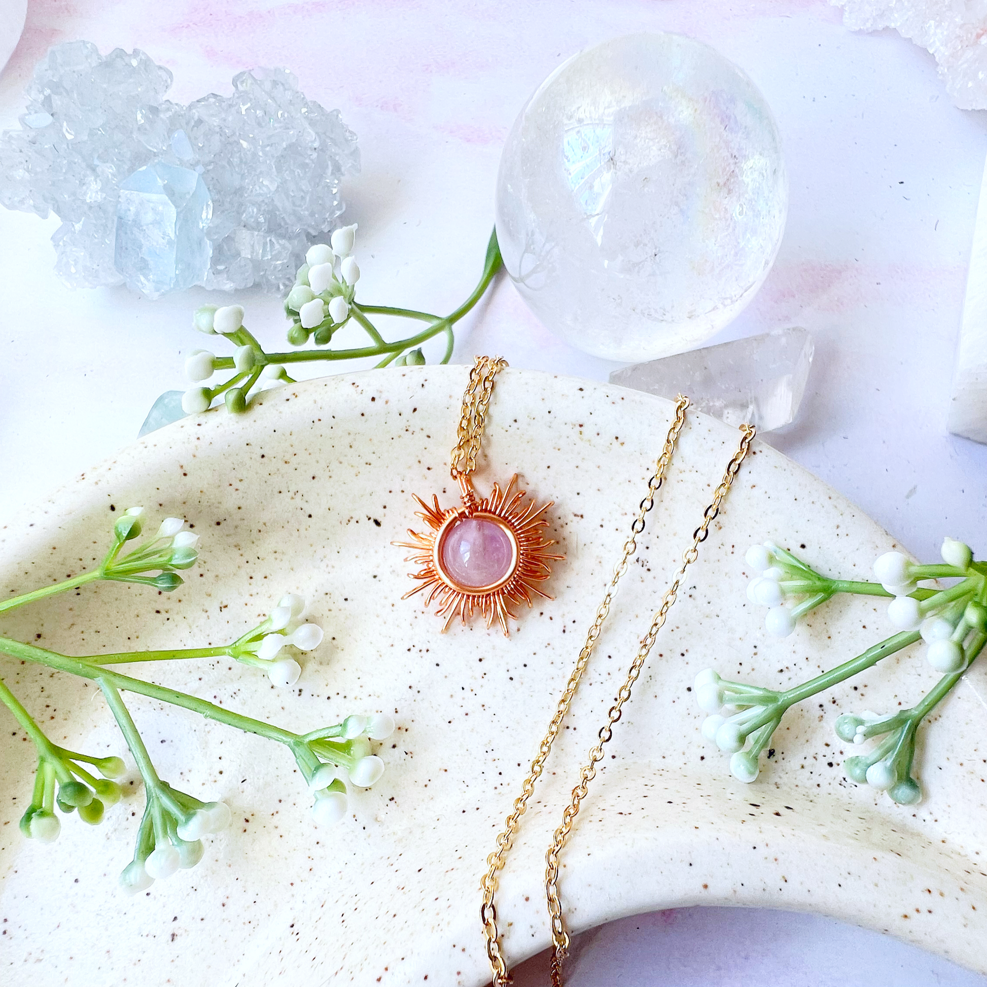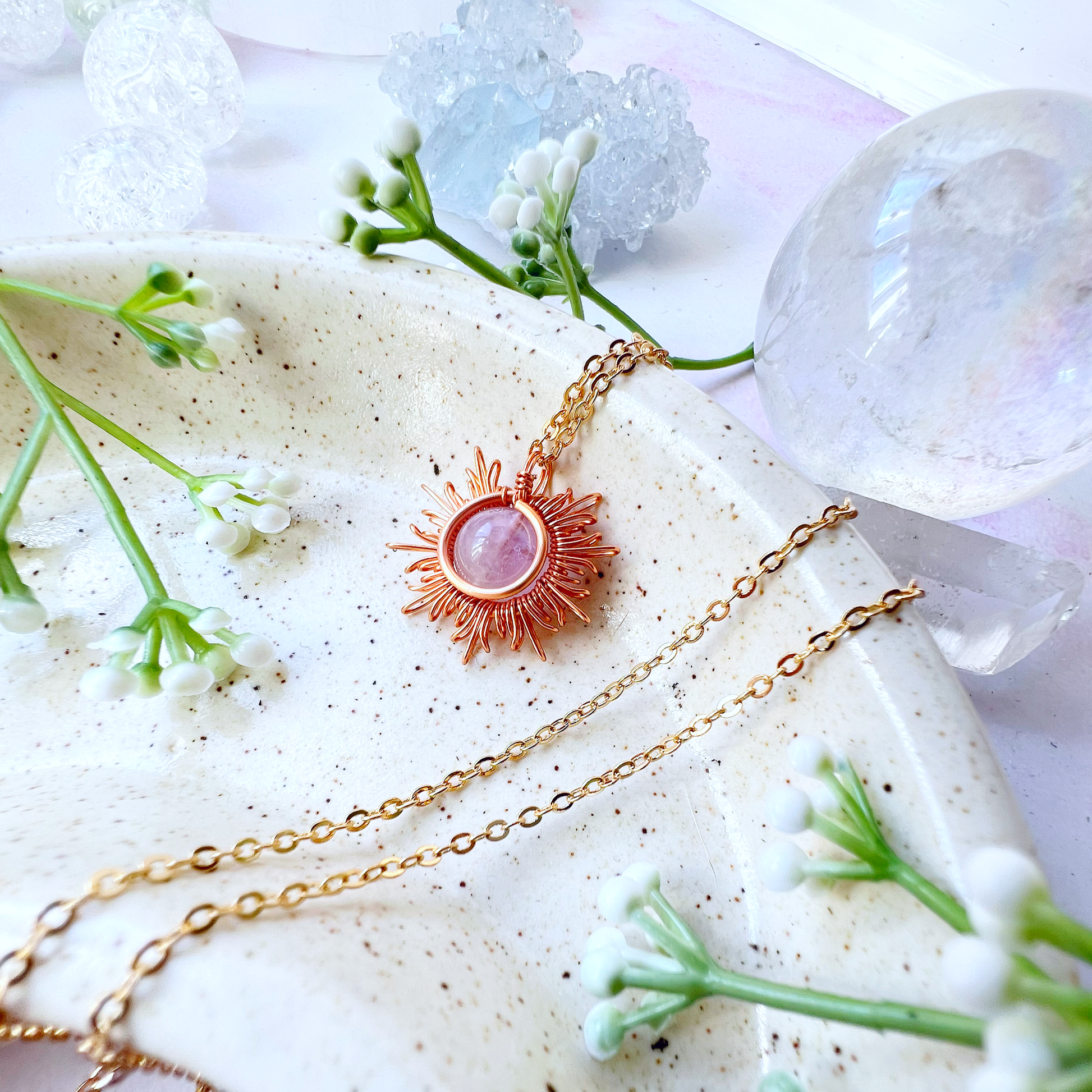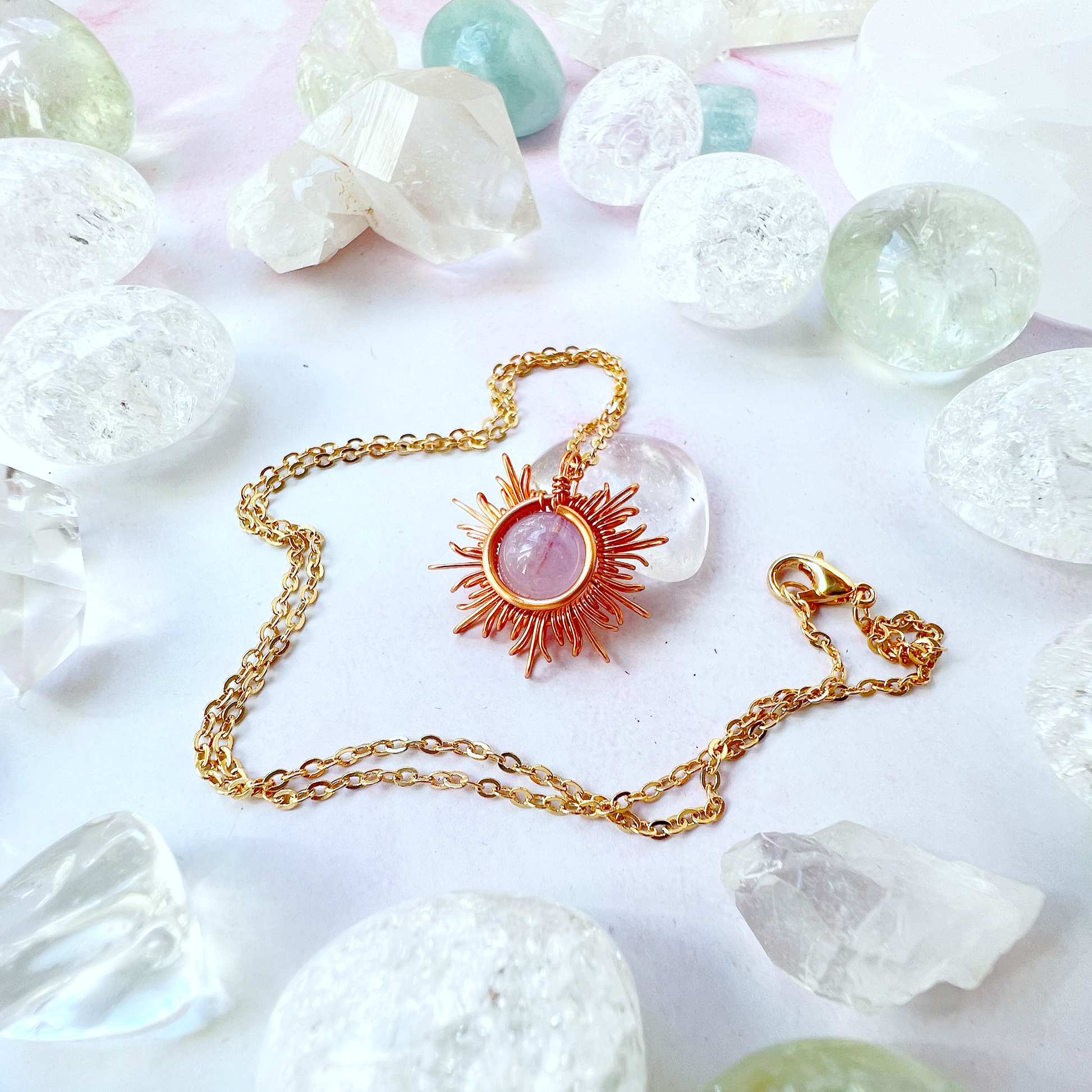 Gorgeous sunburst necklace made with a pretty lavender amethyst and copper coloured wire, finished with a 16” fine gold plated chain.