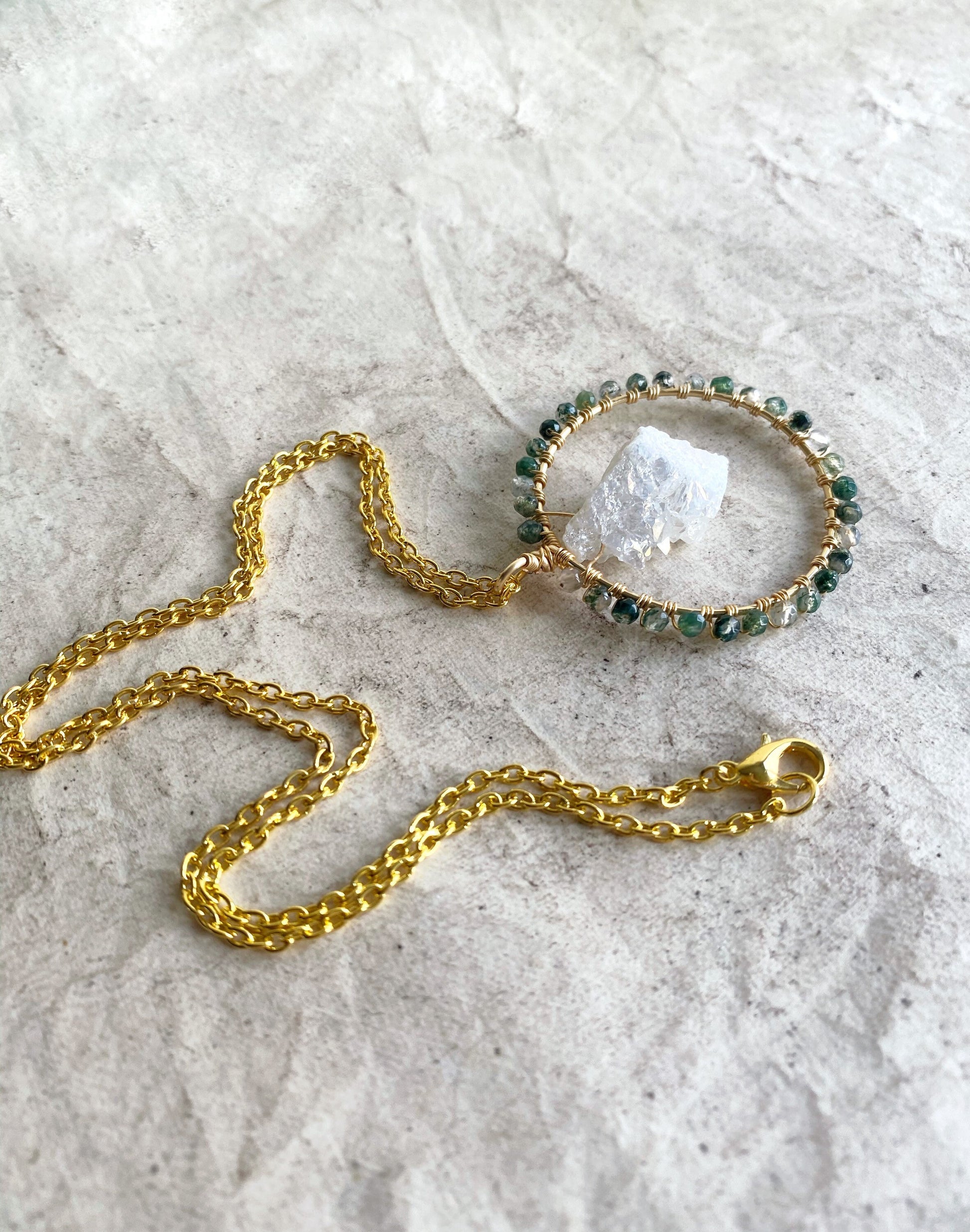 White druzy crystal necklace, moss agate necklace, raw crystal pendant, summer festival jewellery, Gift for her, white witch necklace