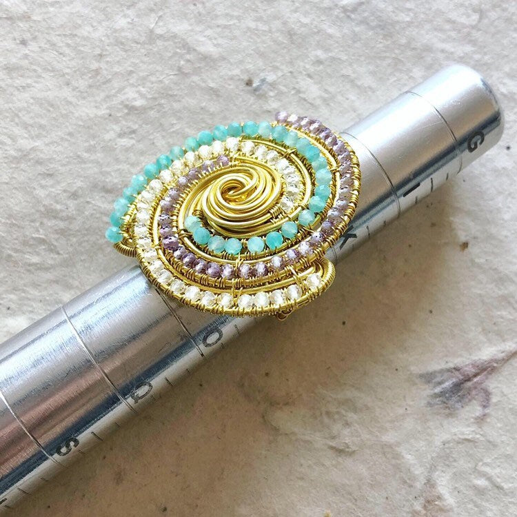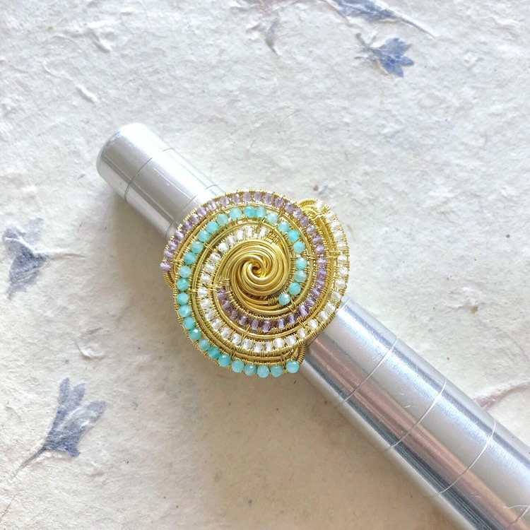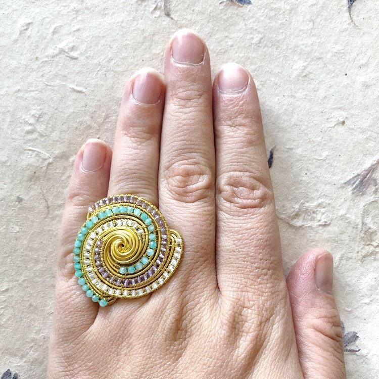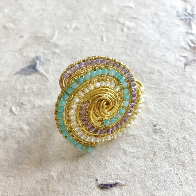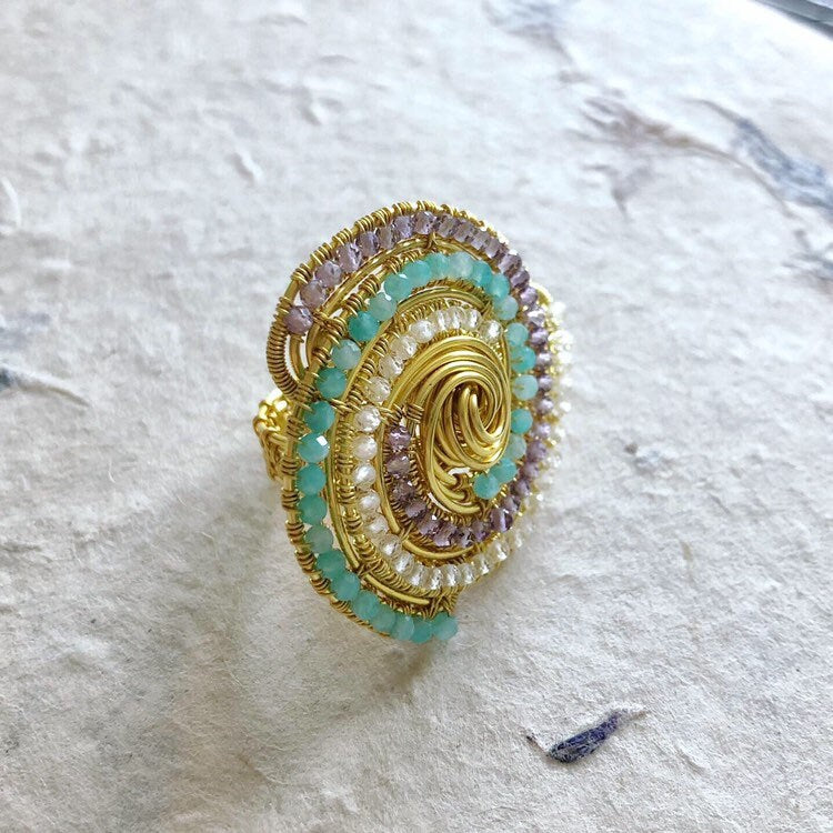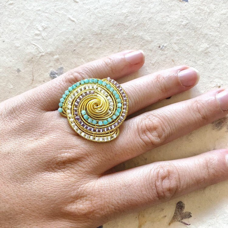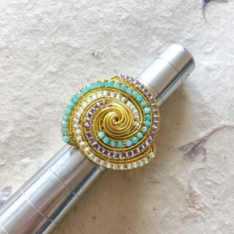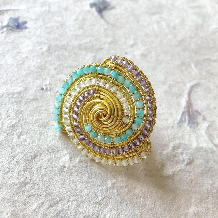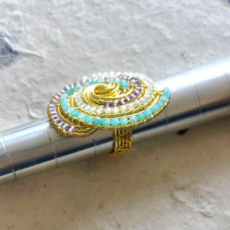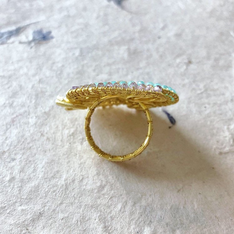 This beautiful statement ring is made from 9ct gold plated wire and ethically sourced natural white topaz, amethyst and Amazonite microfaceted gemstone beads.